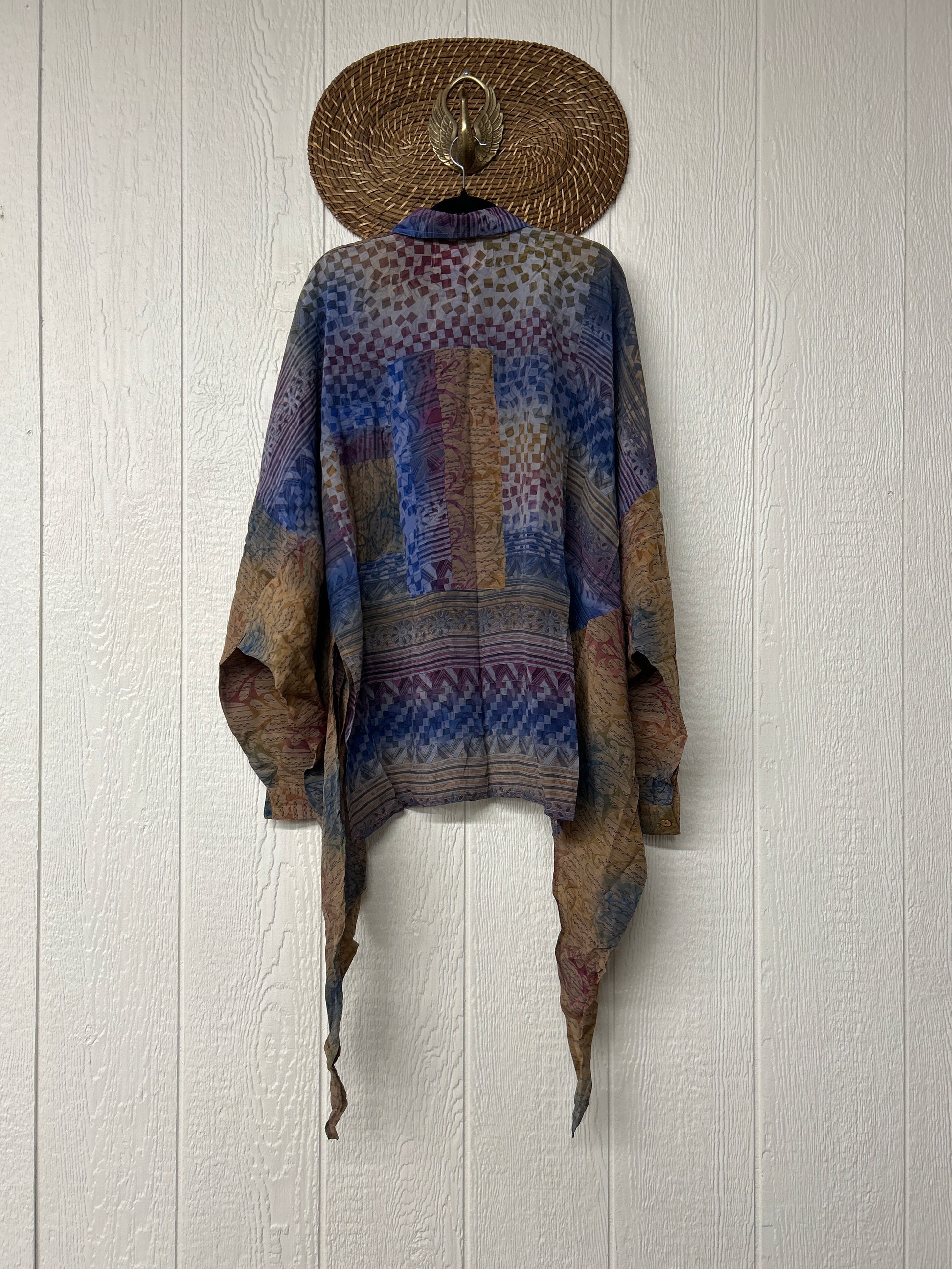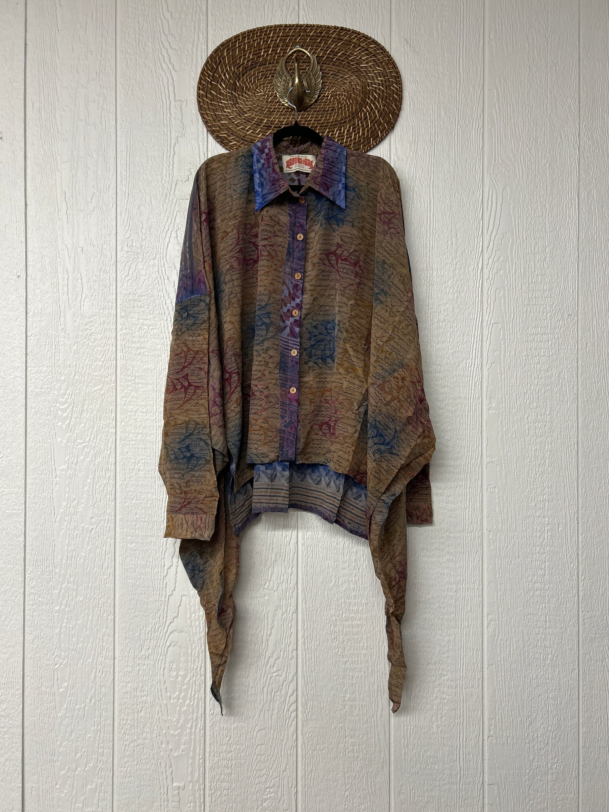 Crafted from our ultra lux vintage crepe sari this floaty dream features a Button-down placket with a high low hem, collar, and button cuffs.