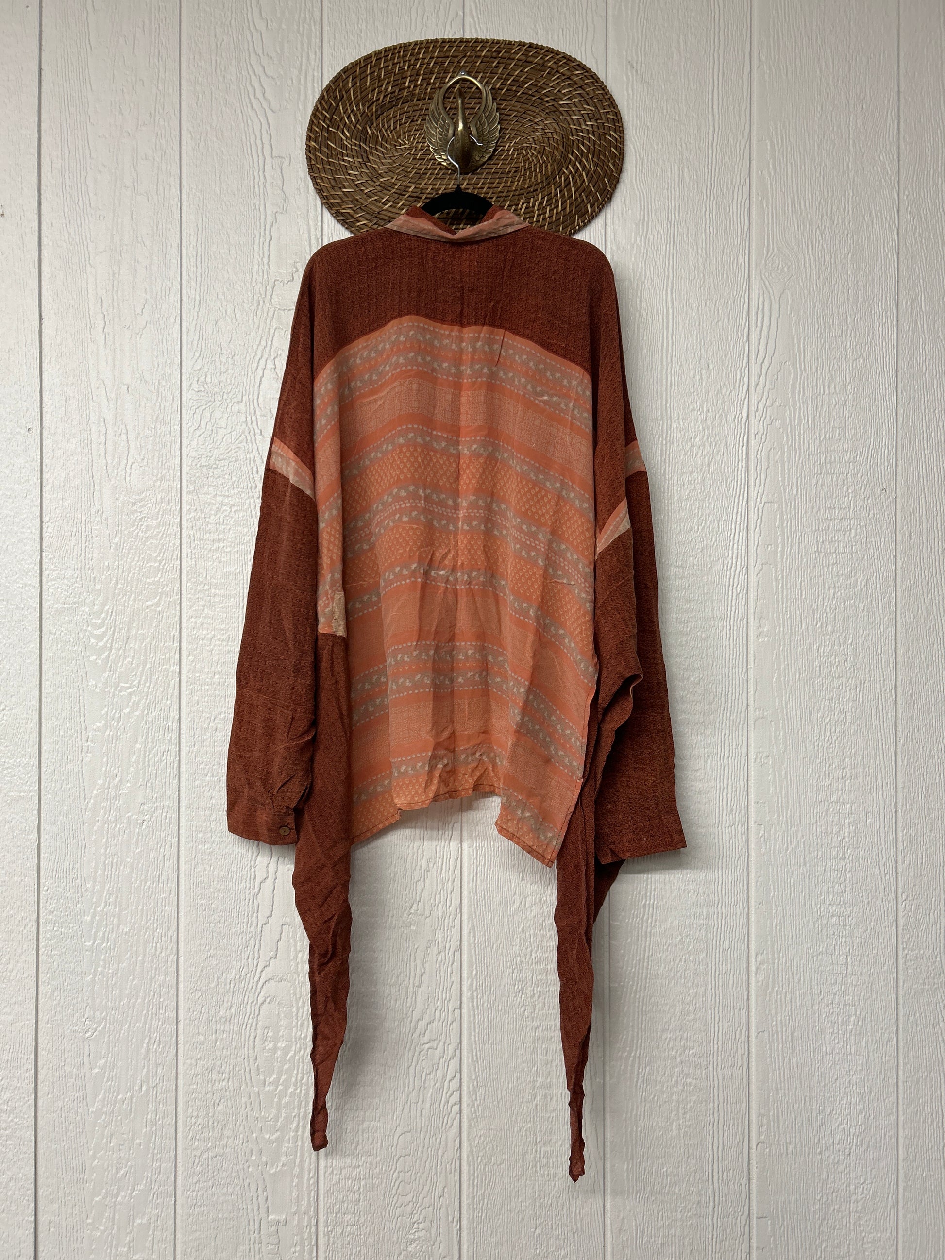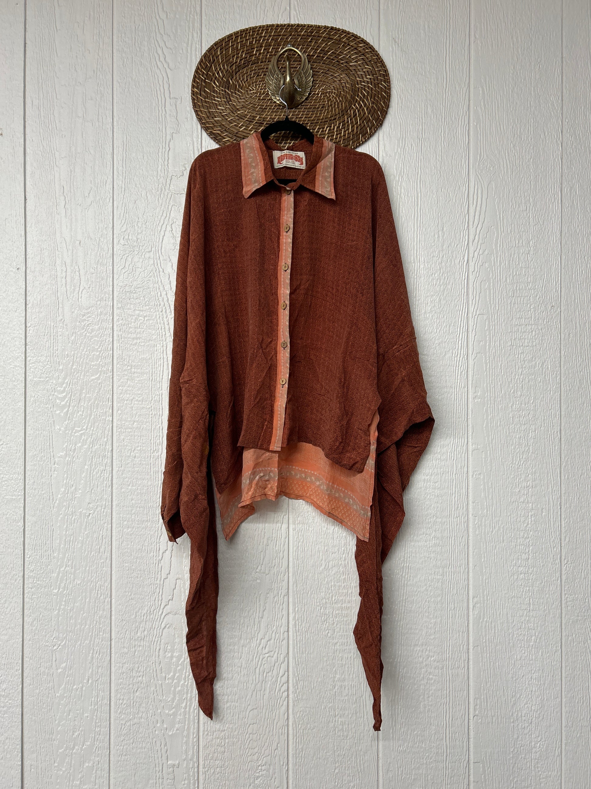 Crafted from our ultra lux vintage crepe sari this floaty dream features a Button-down placket with a high low hem, collar, and button cuffs.