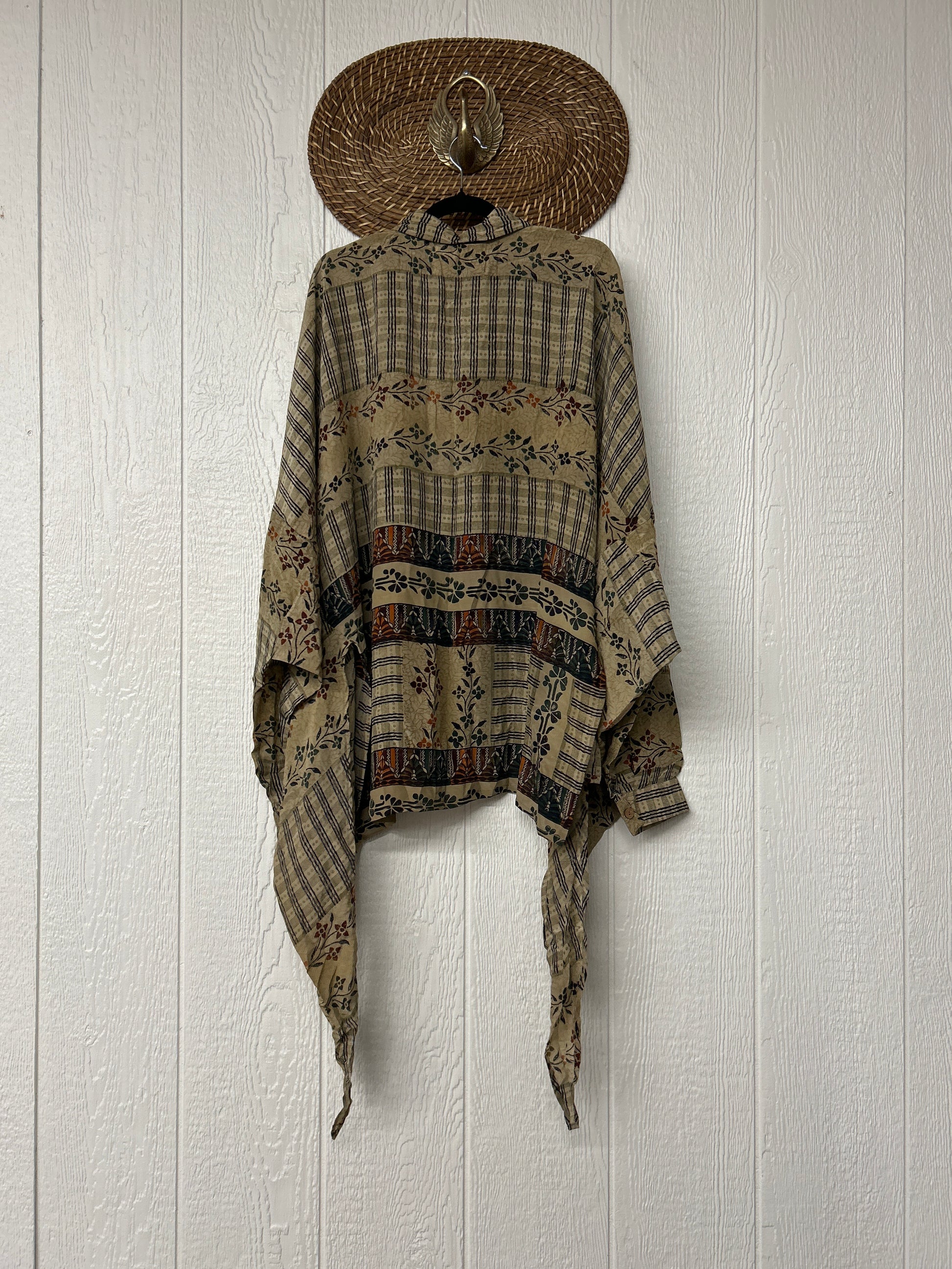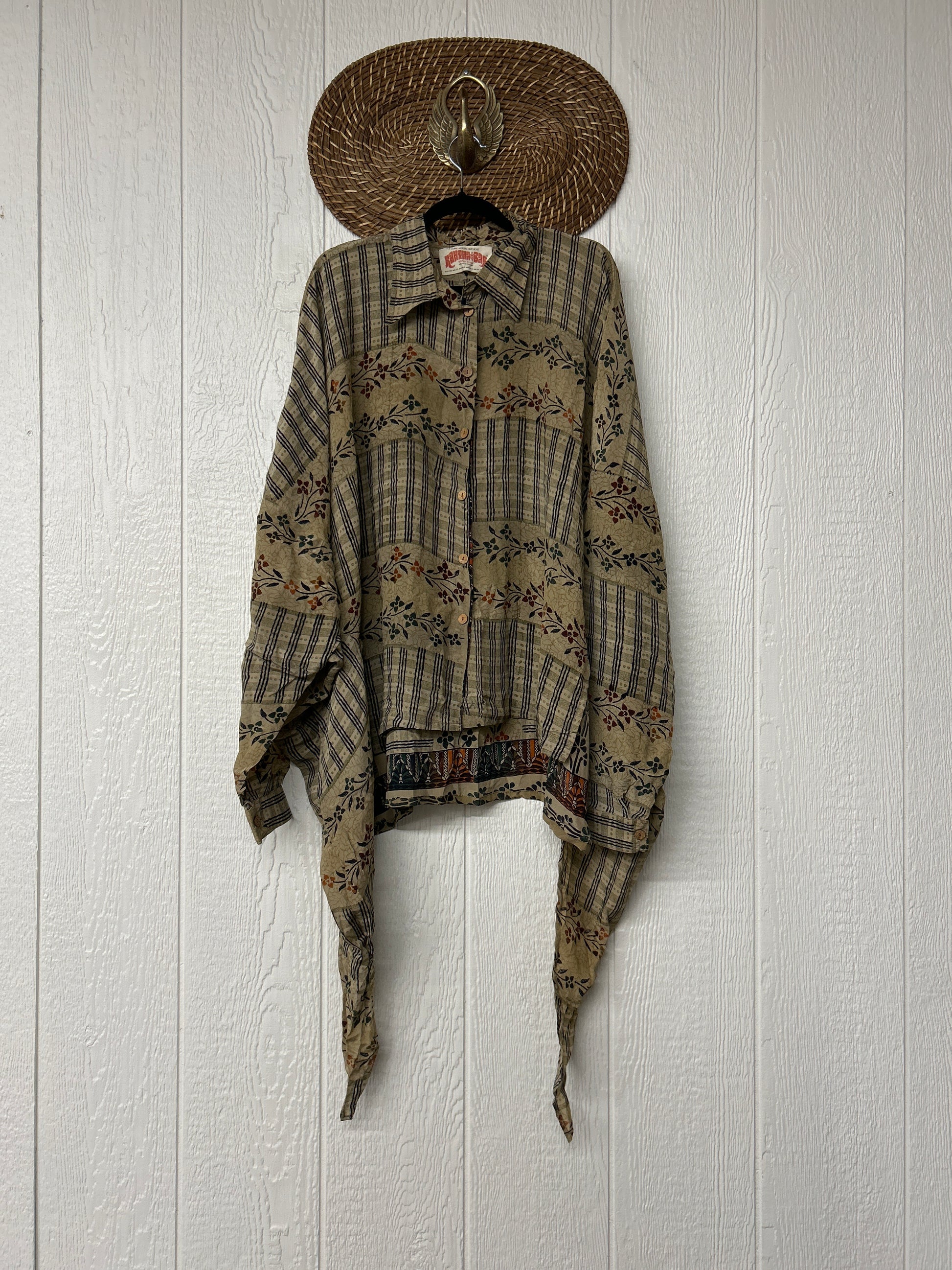 Crafted from our ultra lux vintage crepe sari this floaty dream features a Button-down placket with a high low hem, collar, and button cuffs.