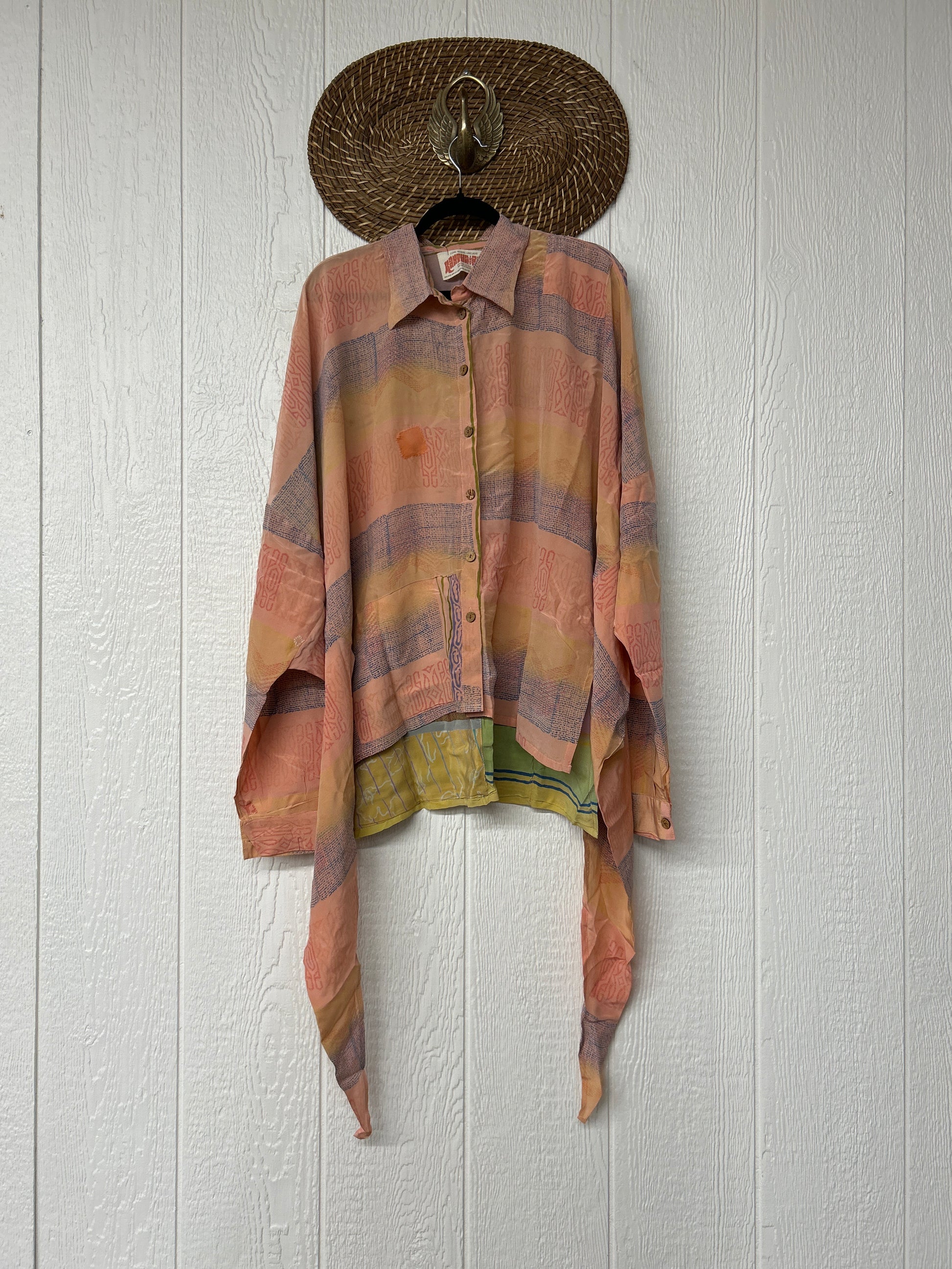 Crafted from our ultra lux vintage crepe sari this floaty dream features a Button-down placket with a high low hem, collar, and button cuffs.