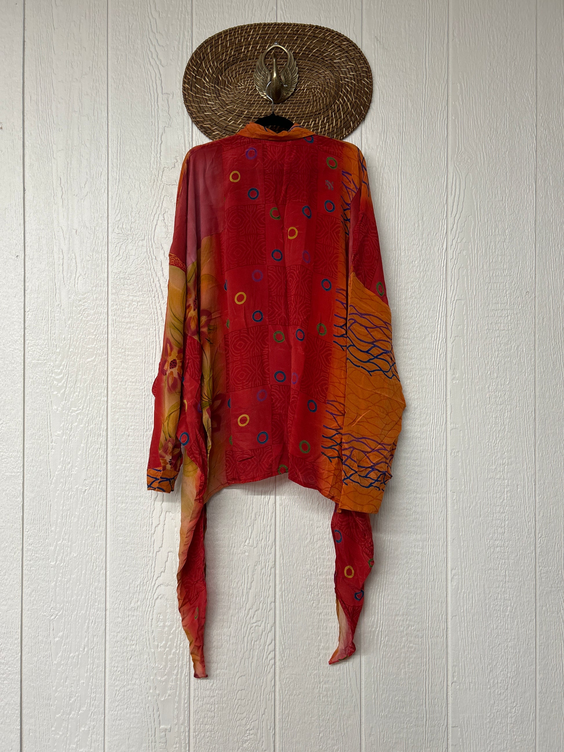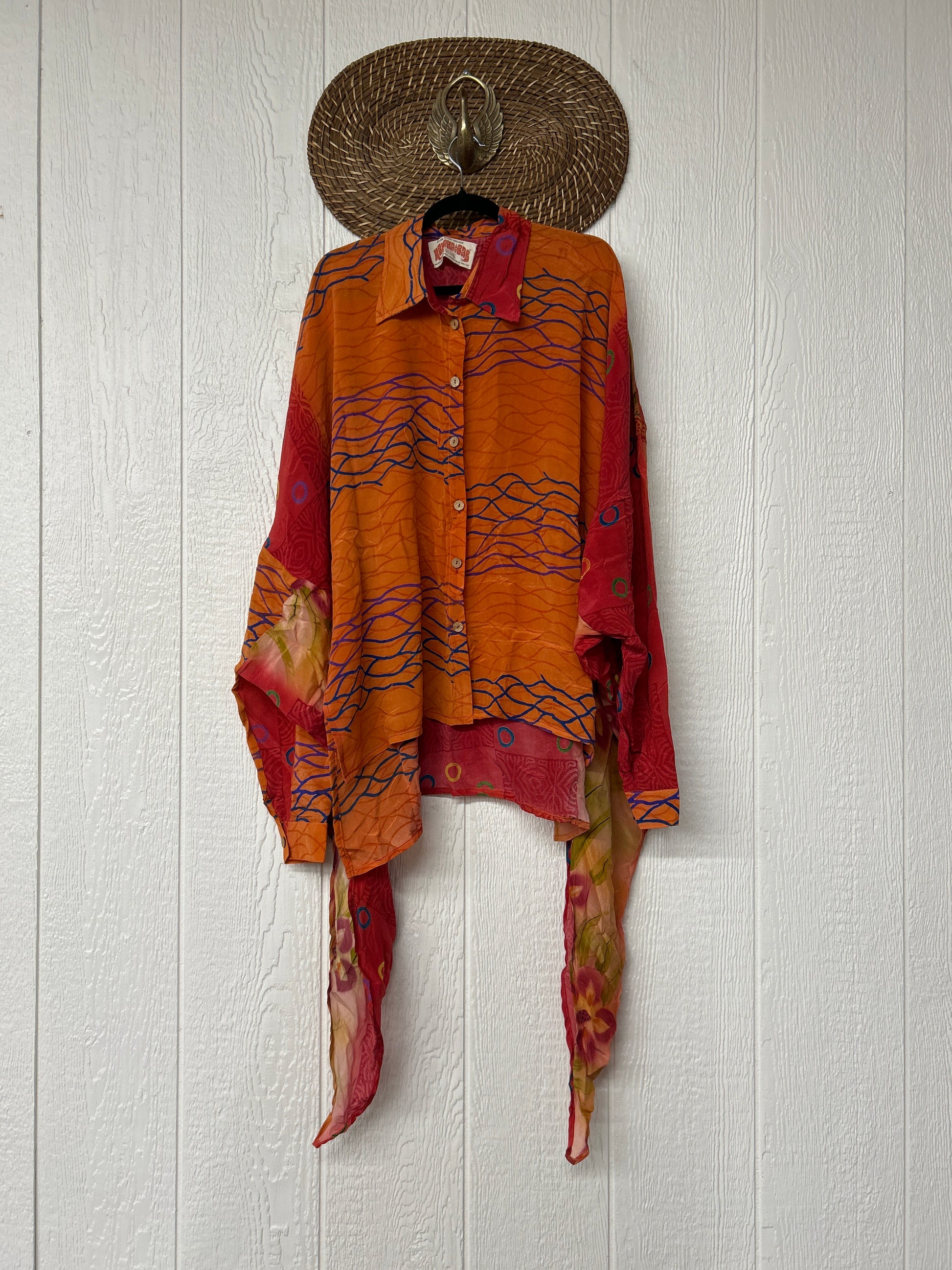 Crafted from our ultra lux vintage crepe sari this floaty dream features a Button-down placket with a high low hem, collar, and button cuffs.