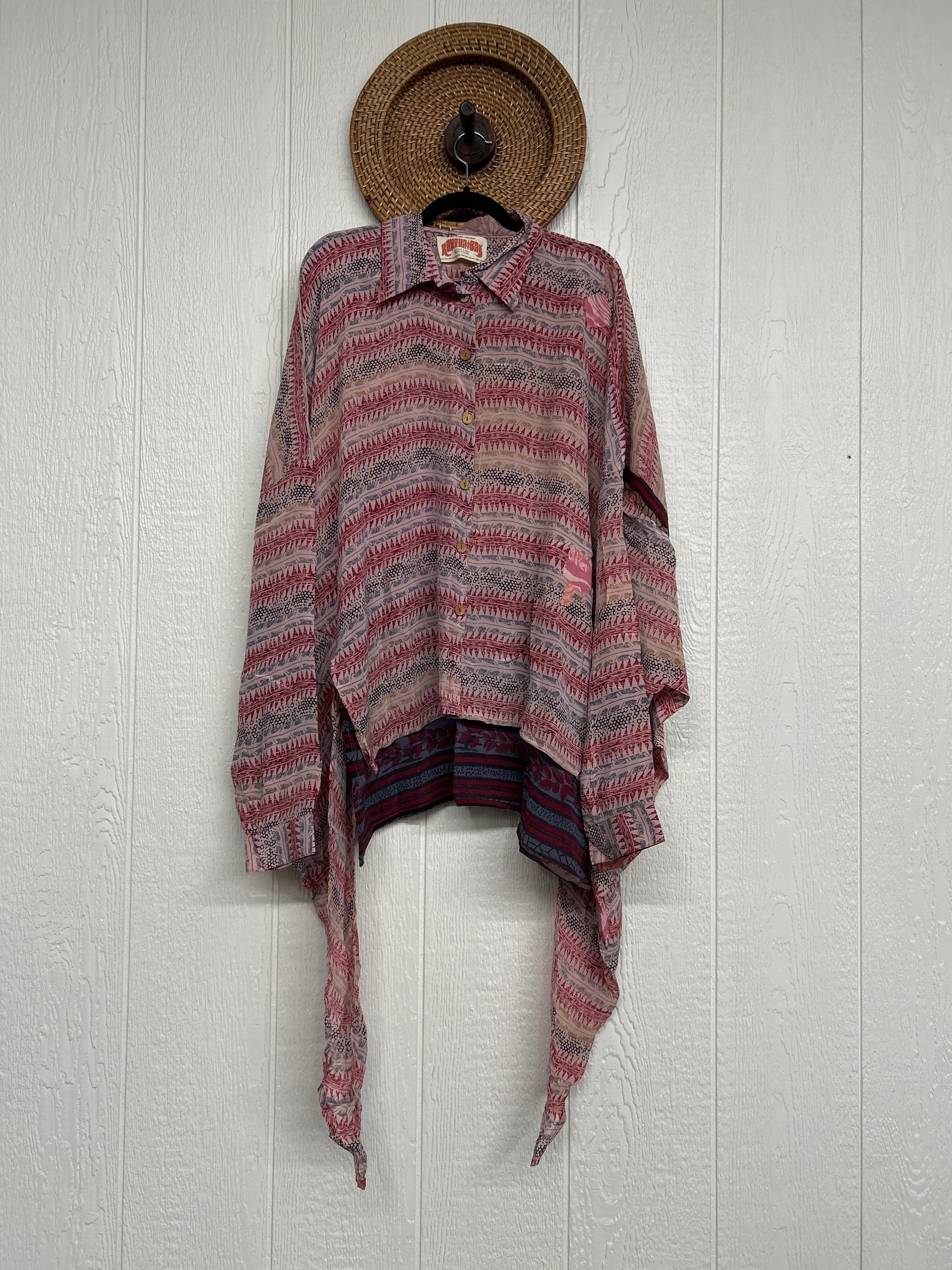 Crafted from our ultra lux vintage crepe sari this floaty dream features a Button-down placket with a high low hem, collar, and button cuffs.