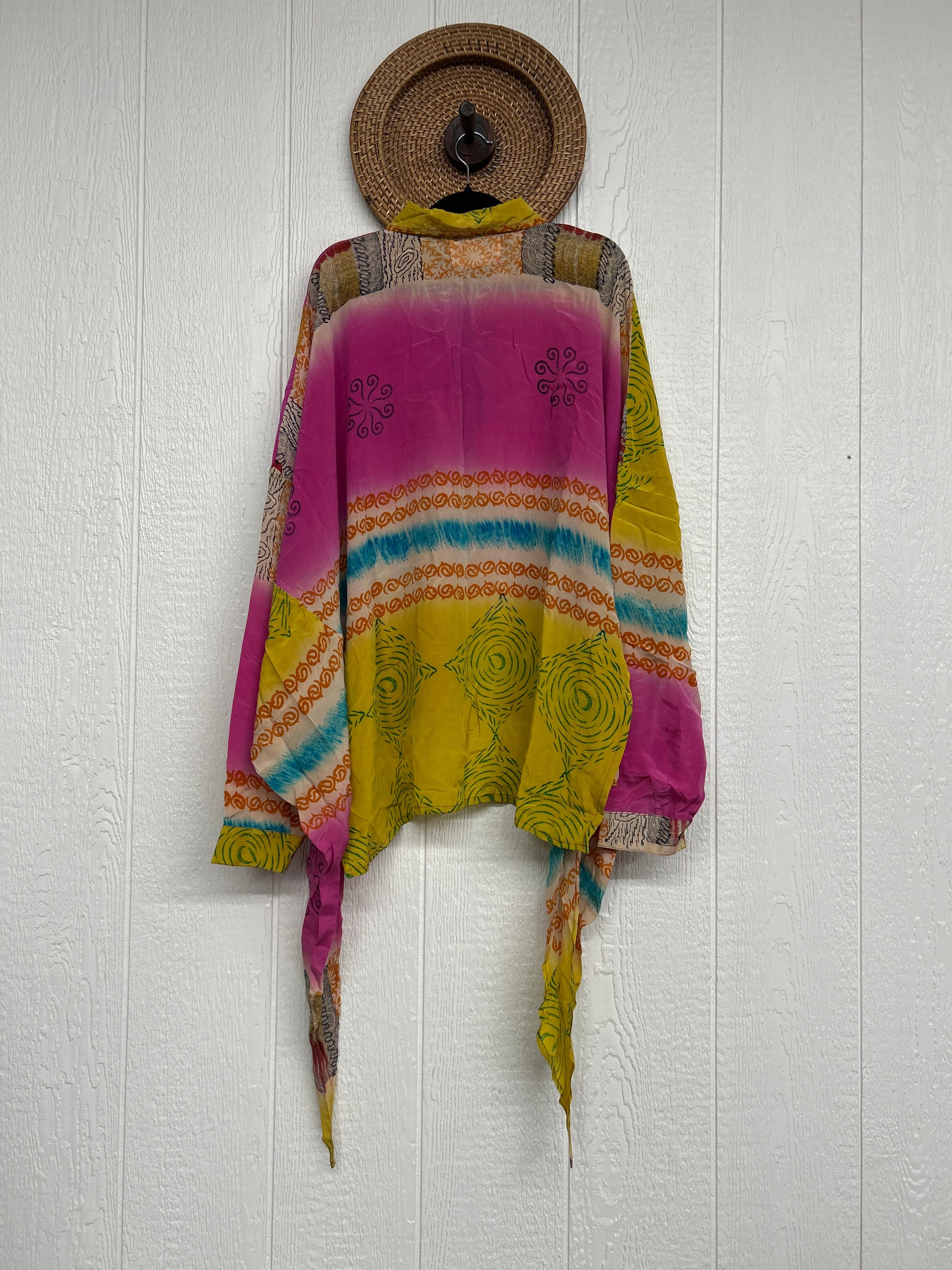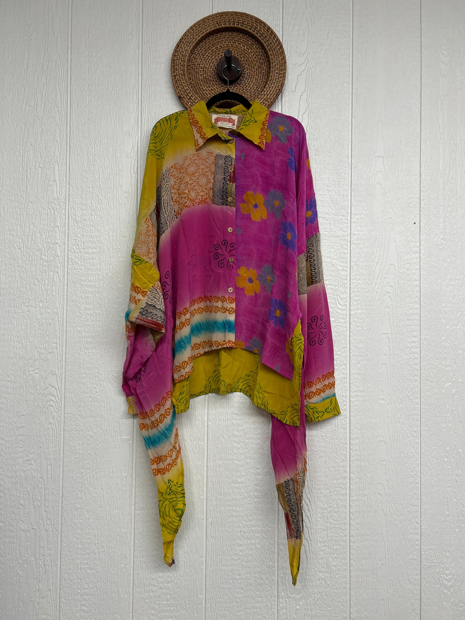 Crafted from our ultra lux vintage crepe sari this floaty dream features a Button-down placket with a high low hem, collar, and button cuffs.