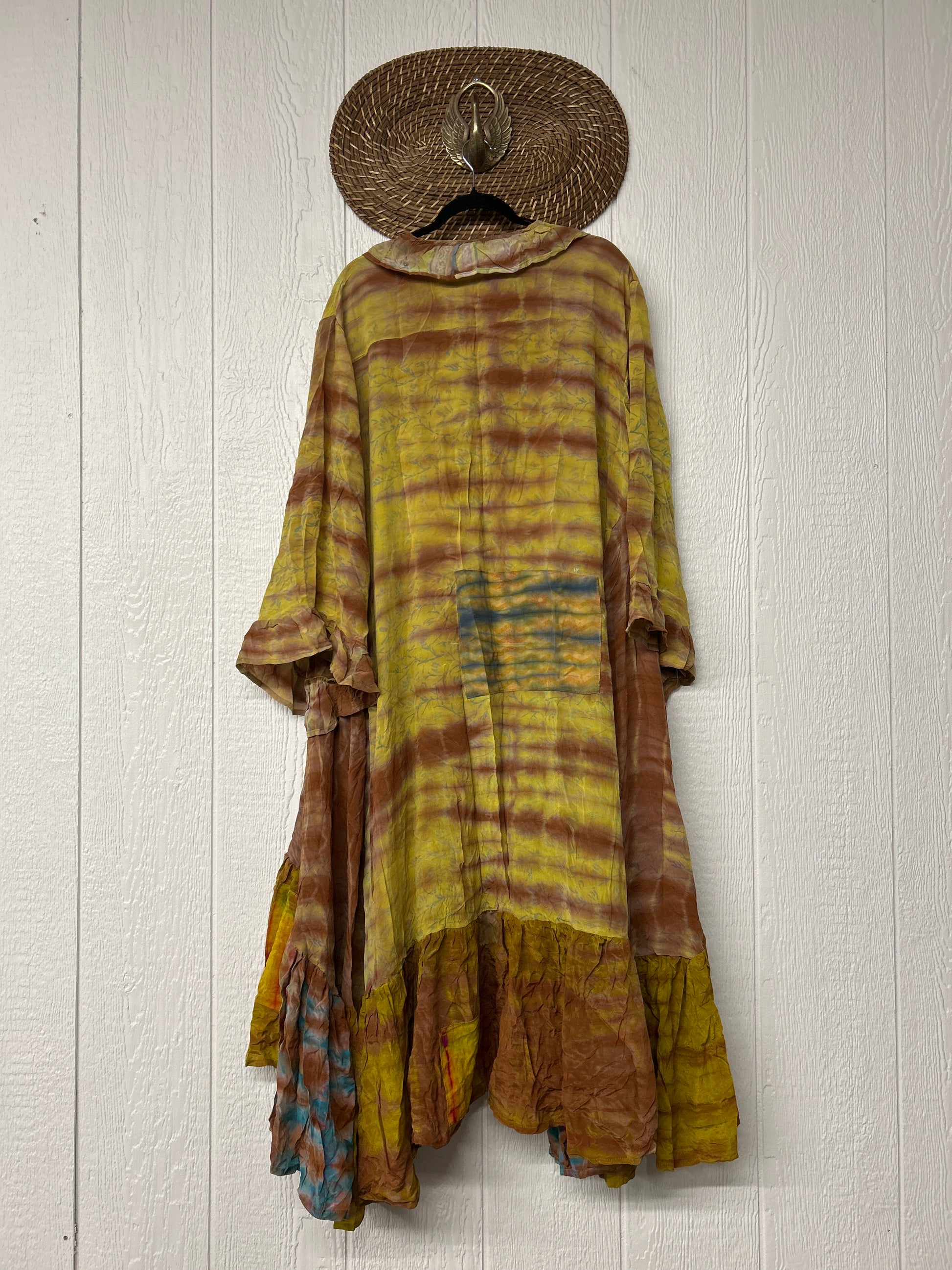 Our pixie duster is pure magic! crafted from ultra lux vintage crepe sari this ethereal layer features ruffles all the way around the outer hem, bell sleeves, double tie closure & high low hem for extra dimension size recommended 00-22/24