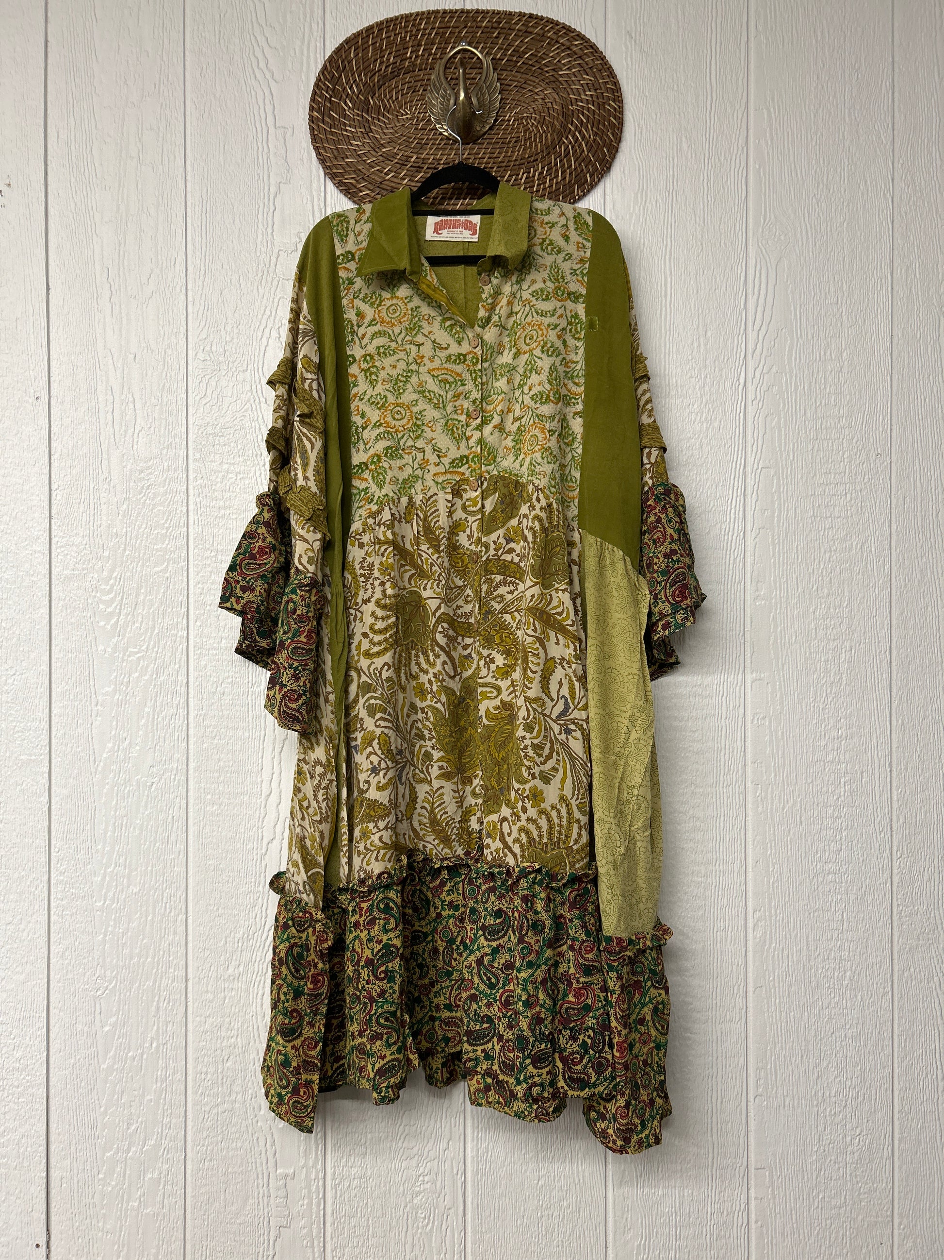 Made from our ultra lux vintage crepe sari this dreamy piece features ruffle bell sleeves, button down front, collar, mixed prints throughout and a fabulous ruffle hem.