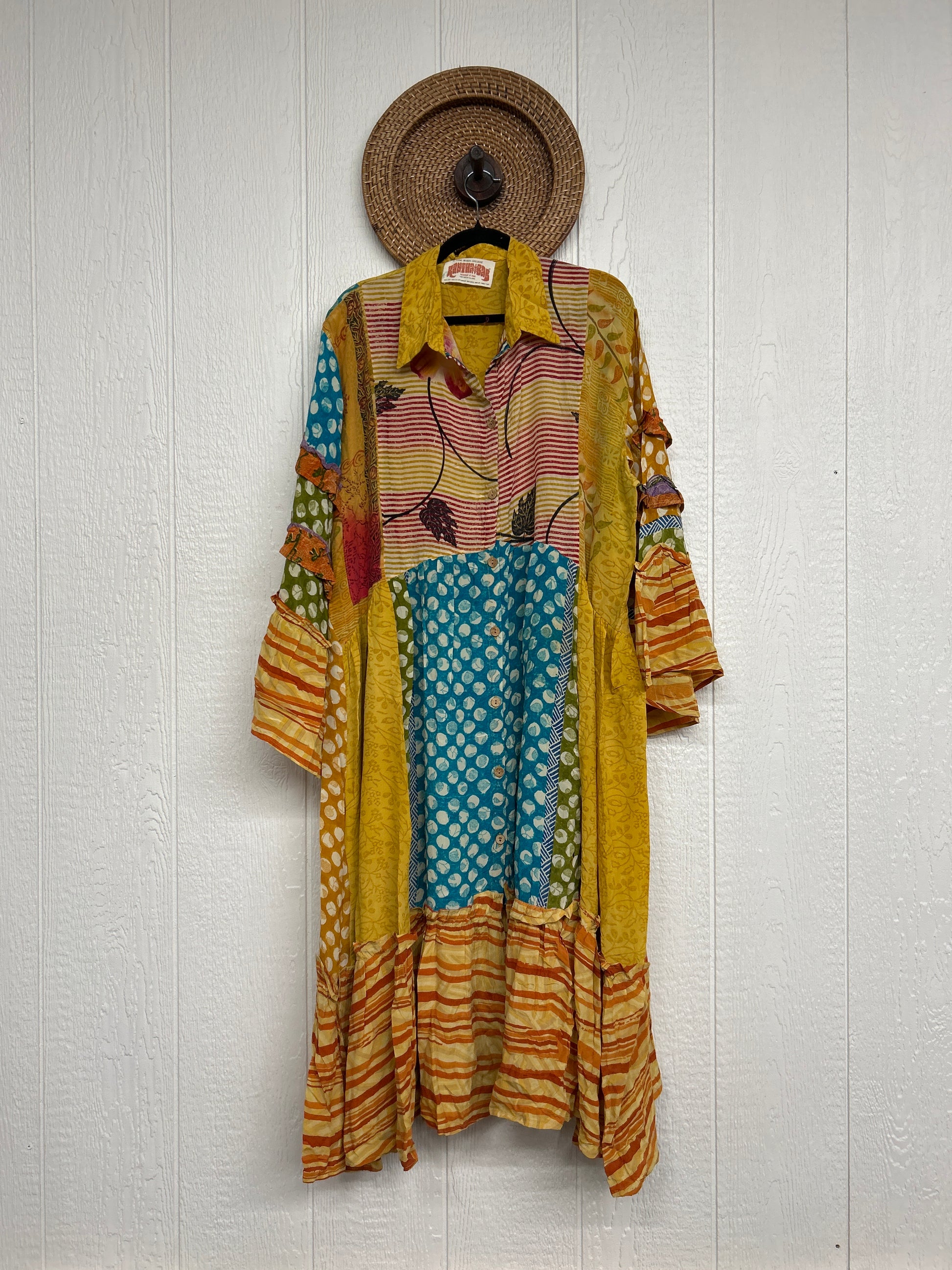 Made from our ultra lux vintage crepe sari this dreamy piece features ruffle bell sleeves, button down front, collar, mixed prints throughout and a fabulous ruffle hem.