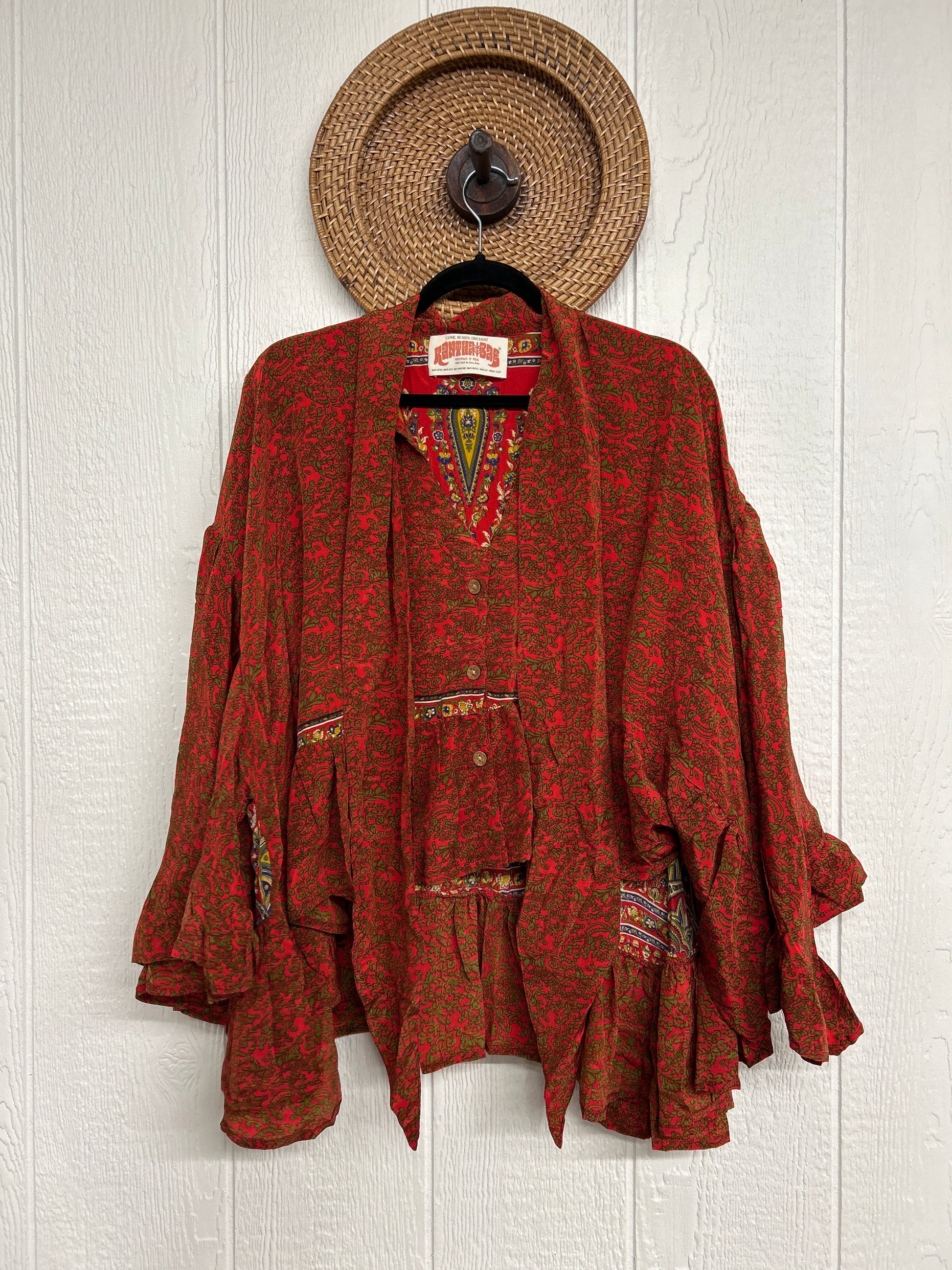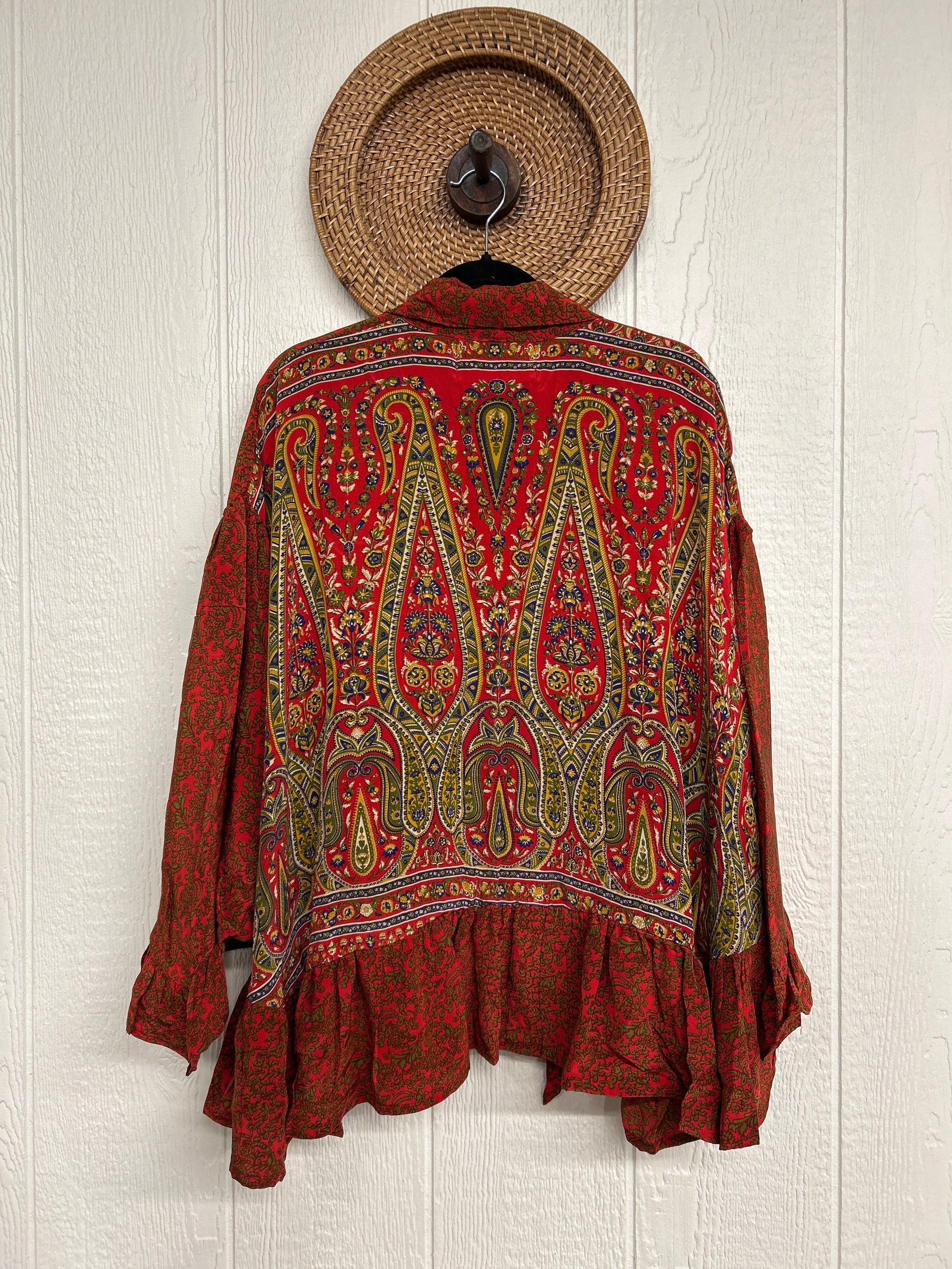 Crafted from vintage crepe sari this romantic piece features ruffles throughout, tie closure on the neck that can be opened or closed, fully functional button placket, high low hem, bell sleeve.