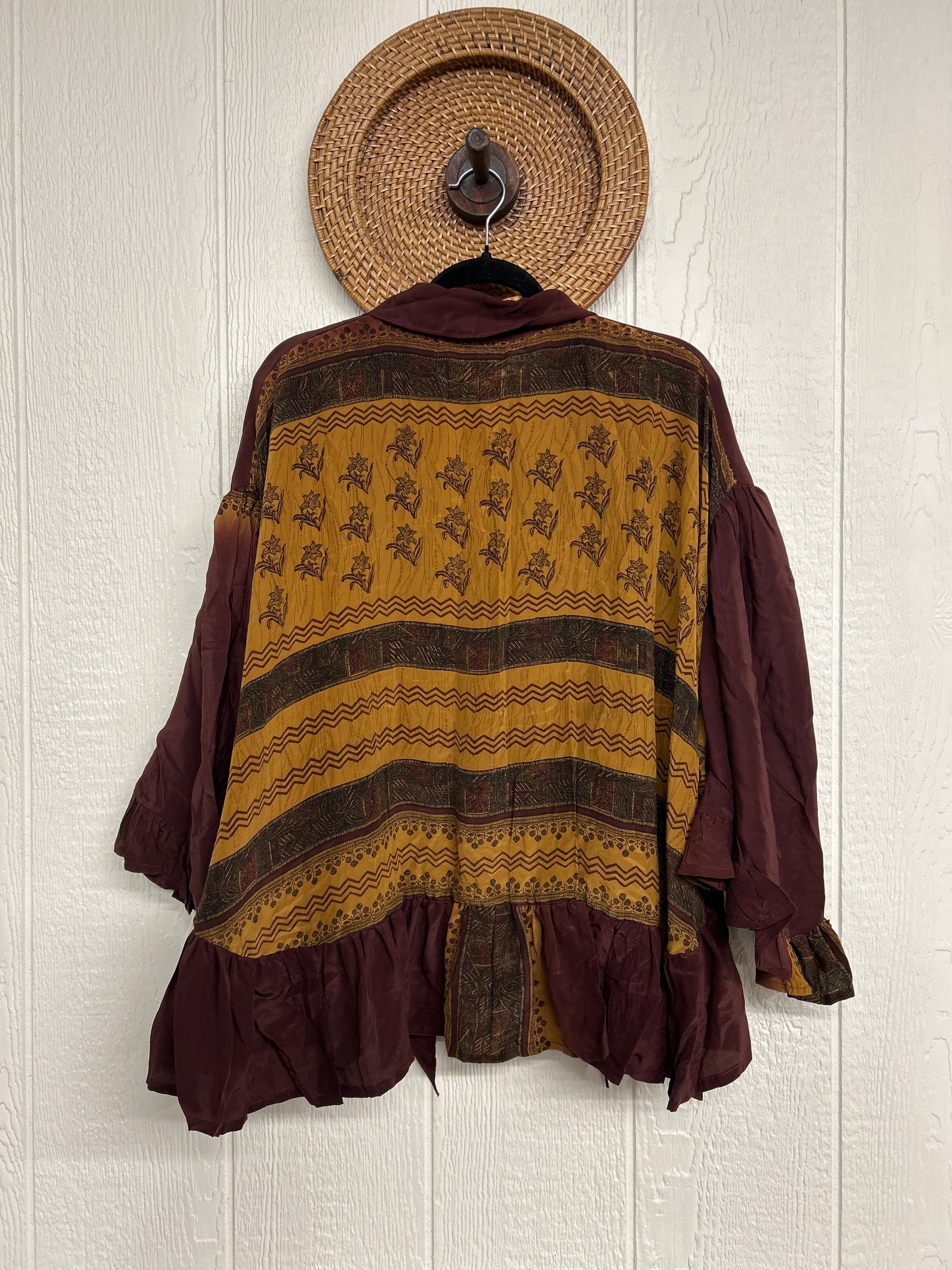Crafted from vintage crepe sari this romantic piece features ruffles throughout, tie closure on the neck that can be opened or closed, fully functional button placket, high low hem, bell sleeve.