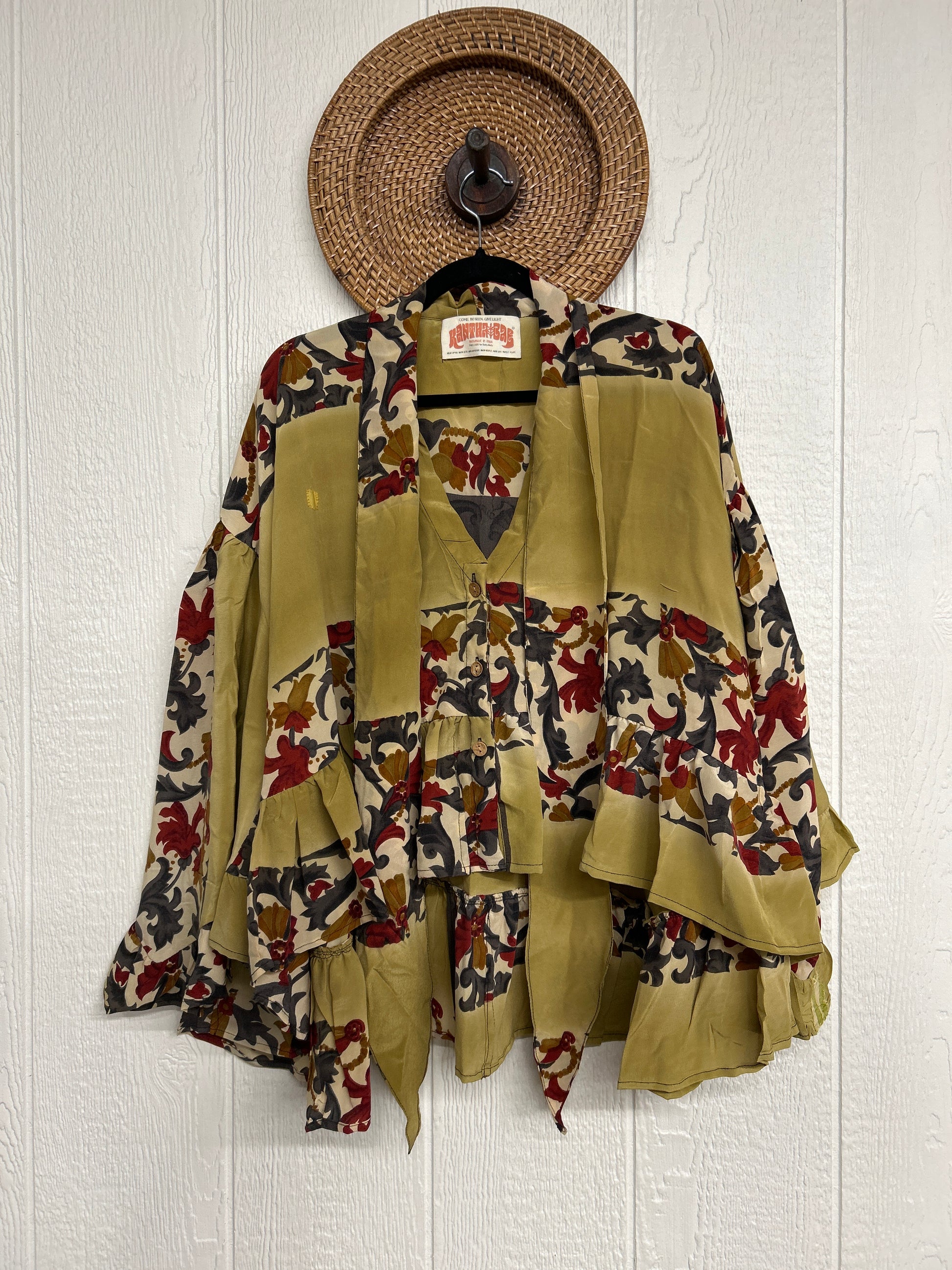 Crafted from vintage crepe sari this romantic piece features ruffles throughout, tie closure on the neck that can be opened or closed, fully functional button placket, high low hem, bell sleeve.
