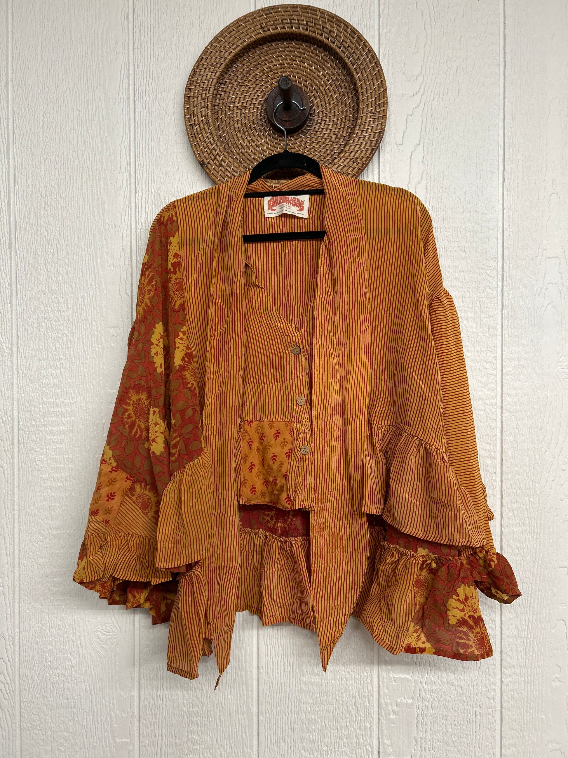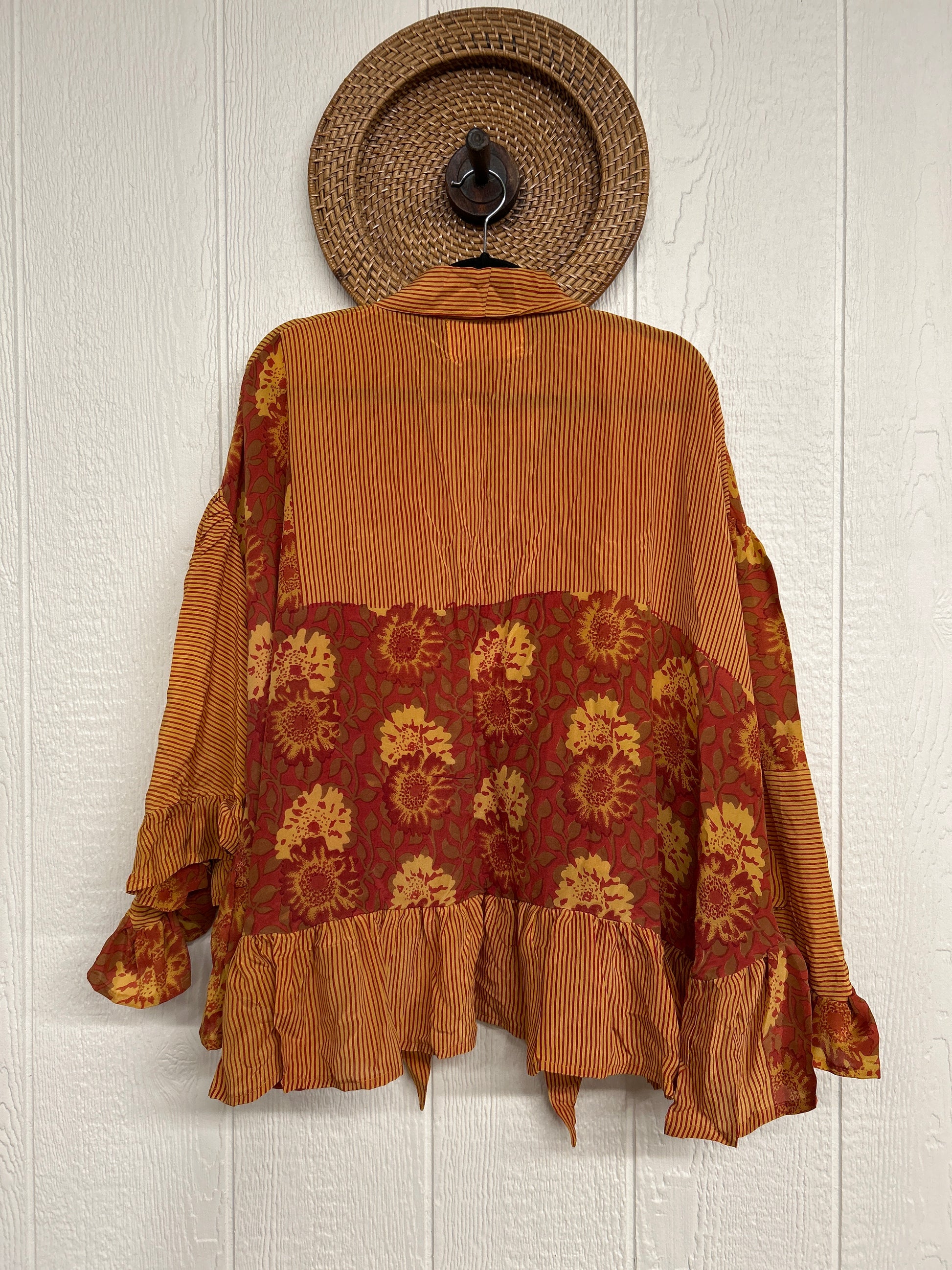 Crafted from vintage crepe sari this romantic piece features ruffles throughout, tie closure on the neck that can be opened or closed, fully functional button placket, high low hem, bell sleeve.