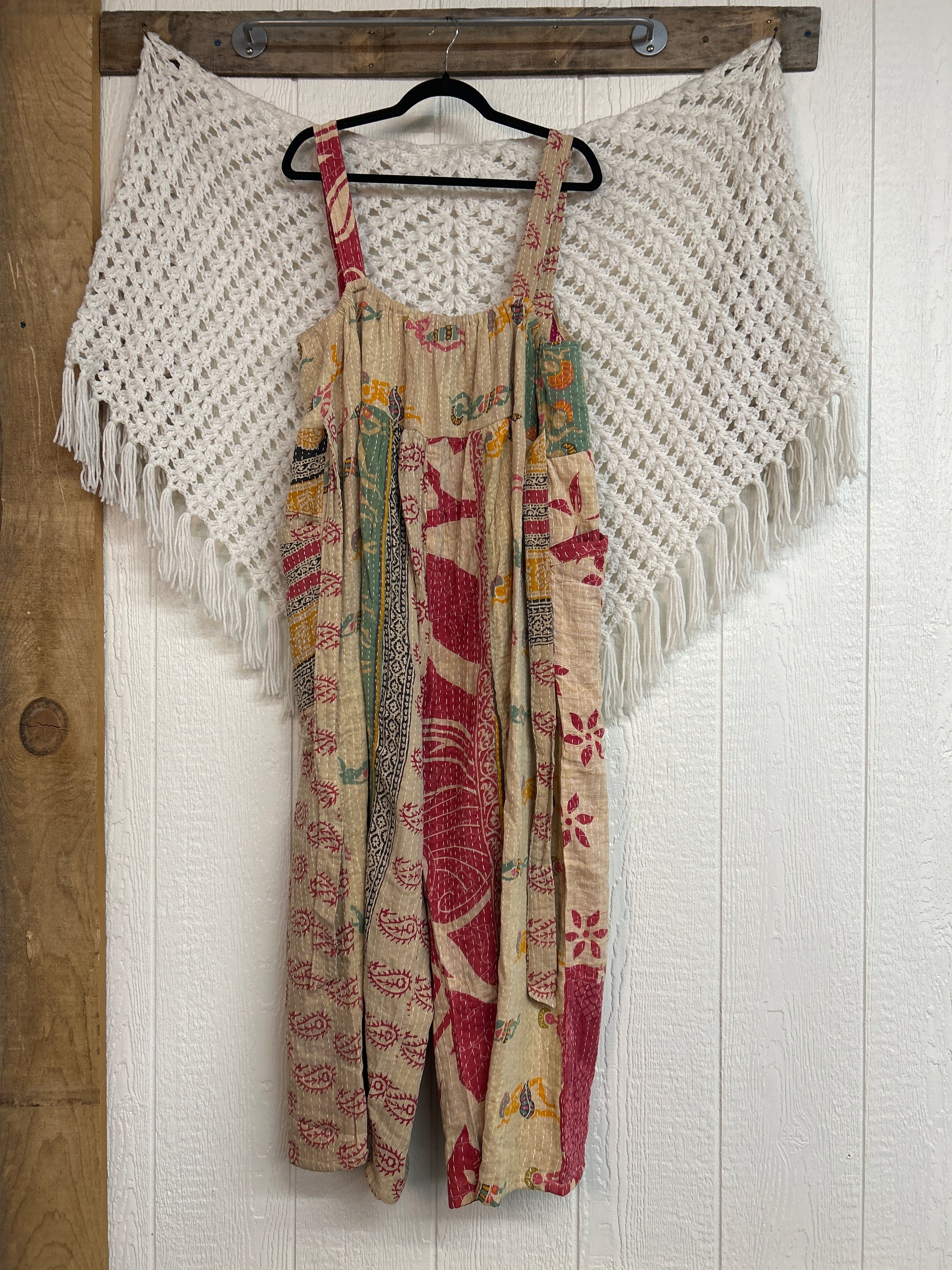 Features adjustable button straps, deep interior pockets, front bib pocket and wide flowy legs