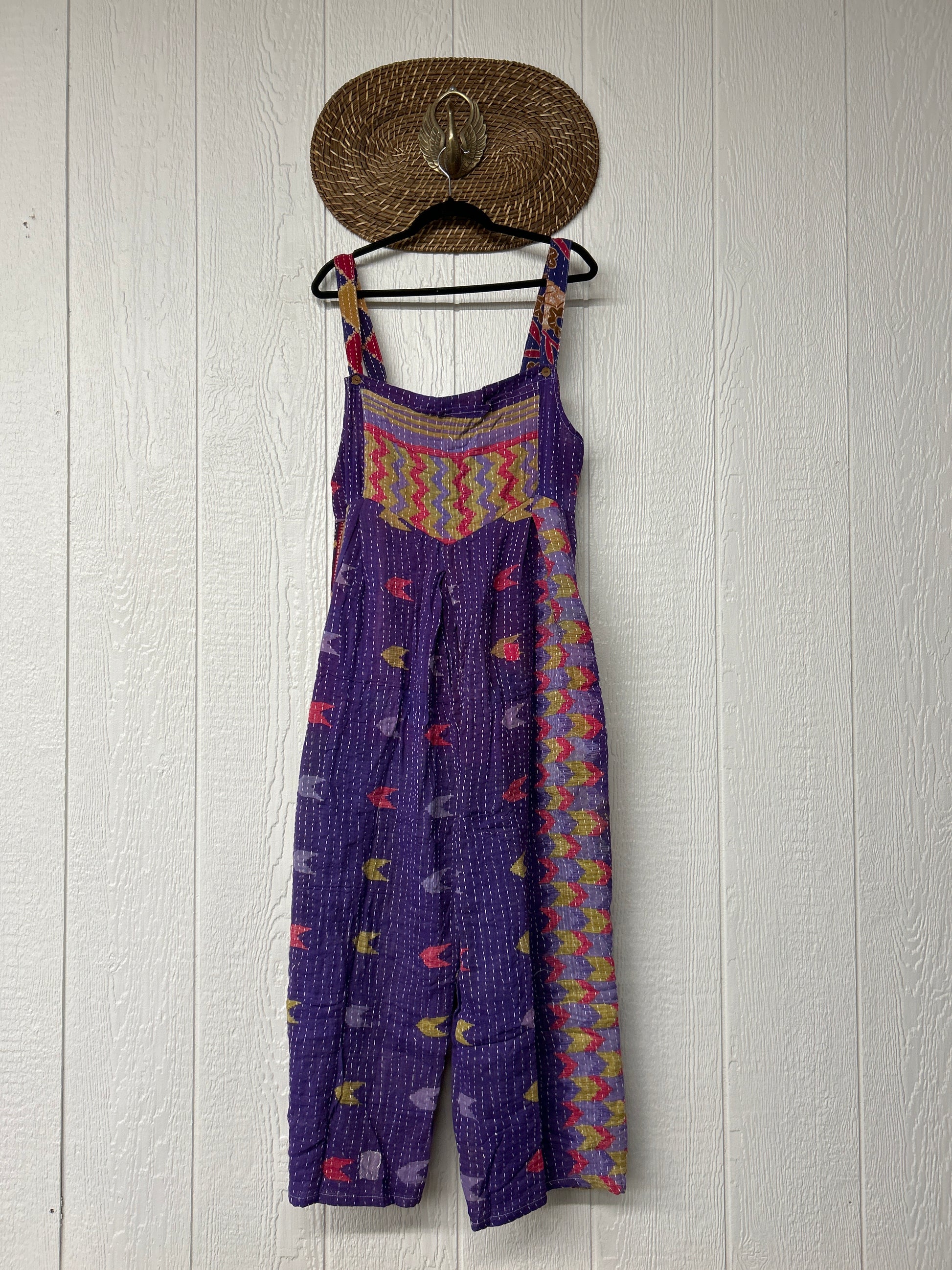 Features adjustable button straps, deep interior pockets, front bib pocket and wide flowy legs