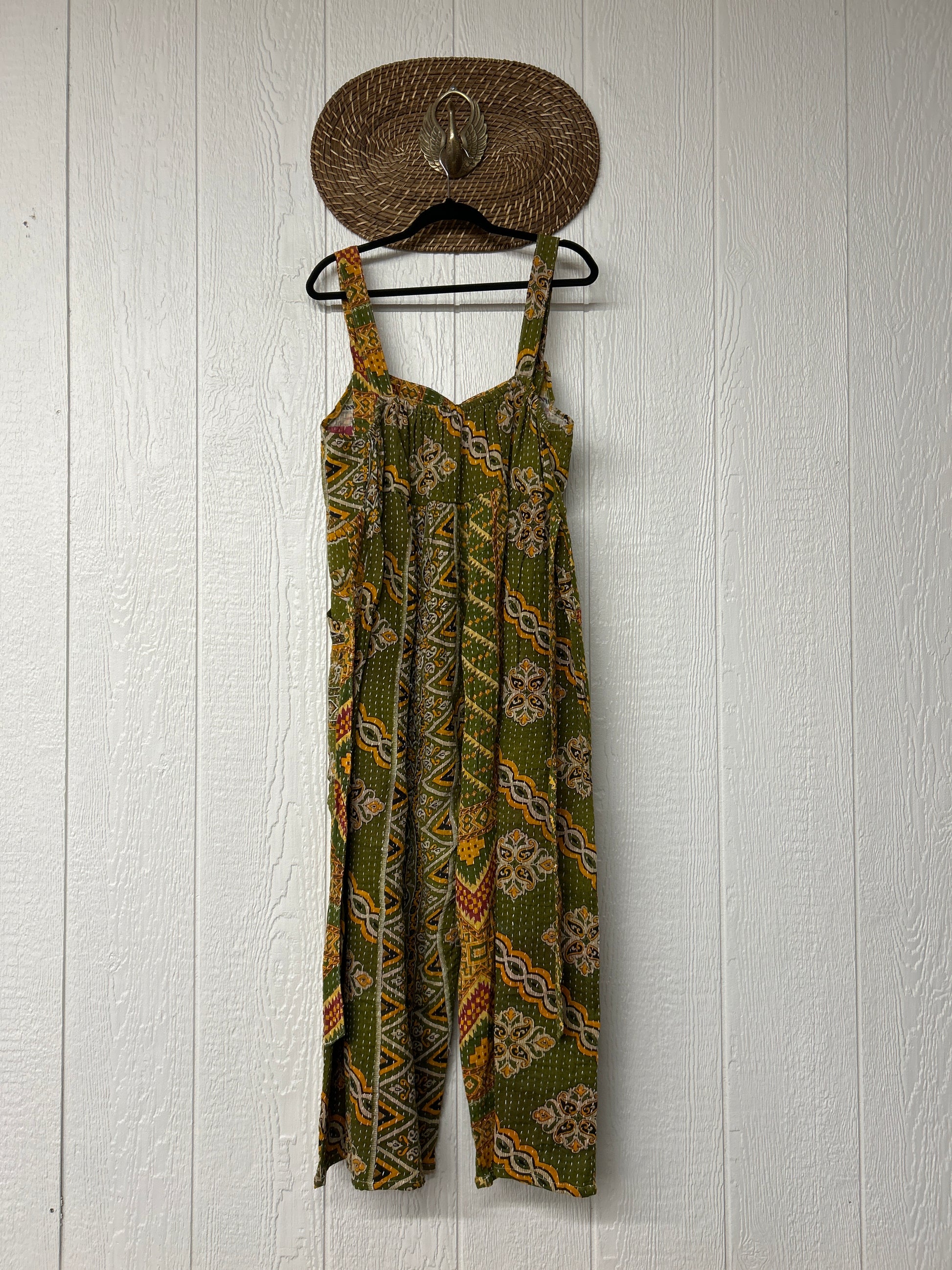 Features adjustable button straps, deep interior pockets, front bib pocket and wide flowy legs