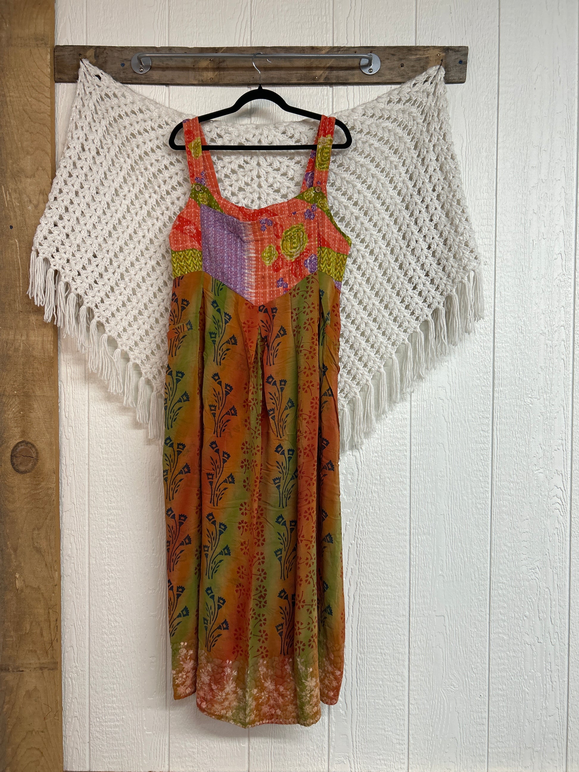 Perfect for EVERY season this overall dress features a kantha bib front with center pocket, adjustable button straps, tie back, crepe skirt and interior pockets on the skirt.