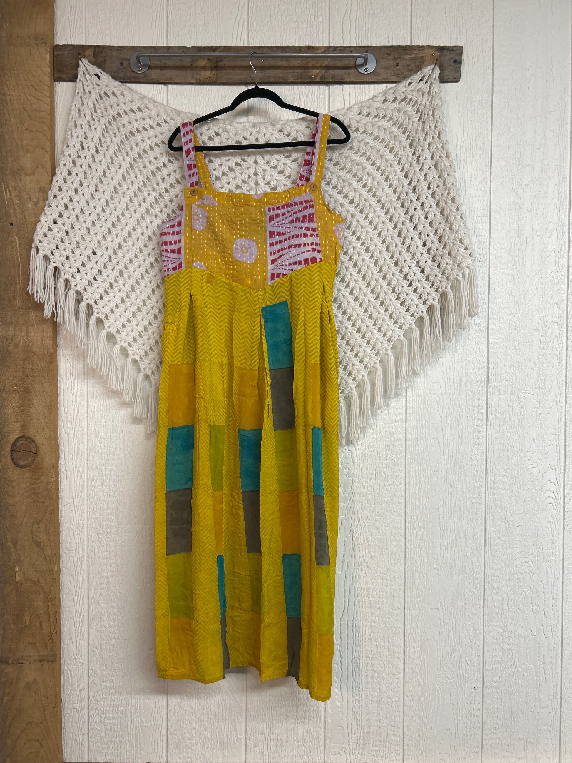 Perfect for EVERY season this overall dress features a kantha bib front with center pocket, adjustable button straps, tie back, crepe skirt and interior pockets on the skirt.