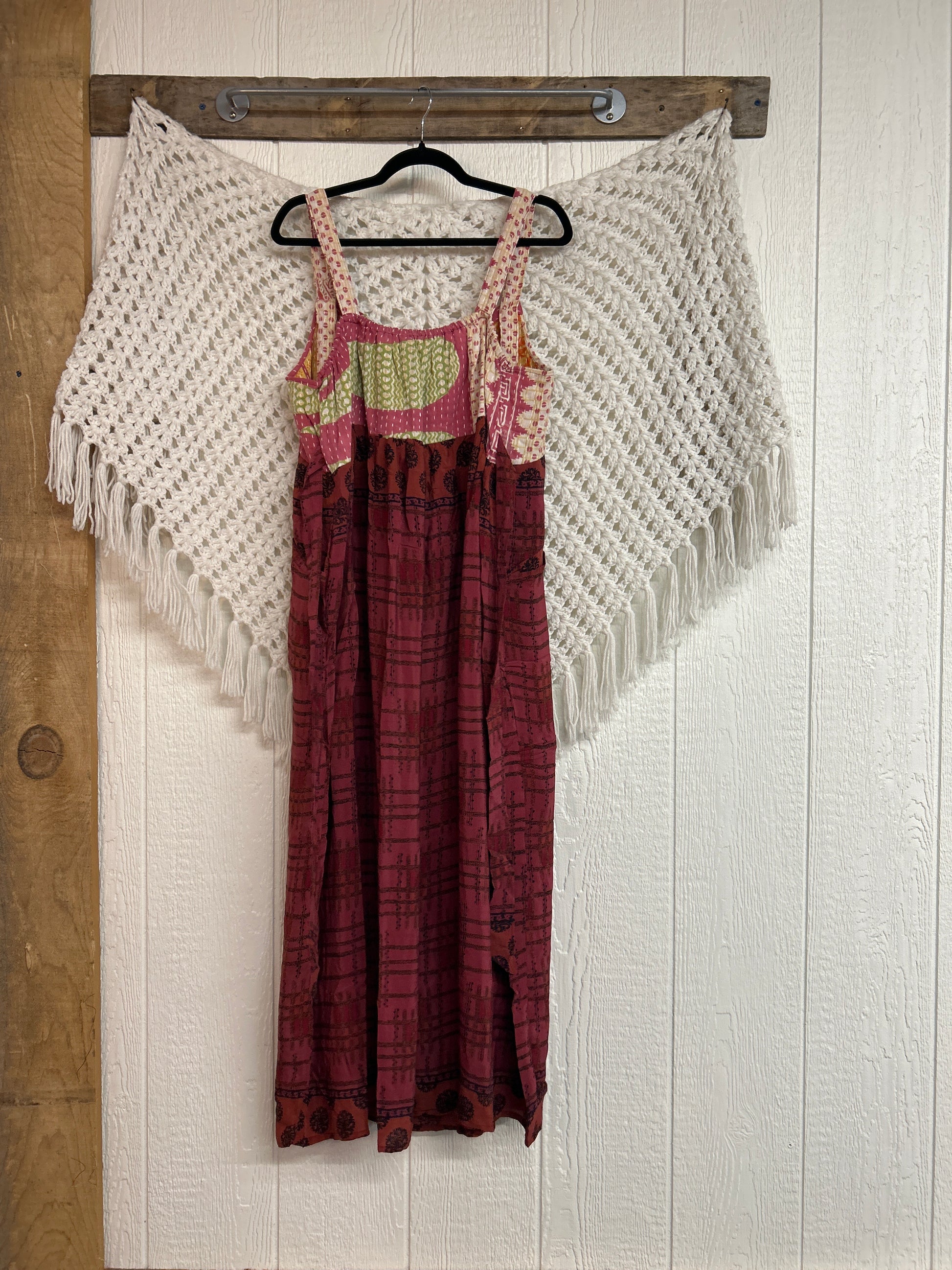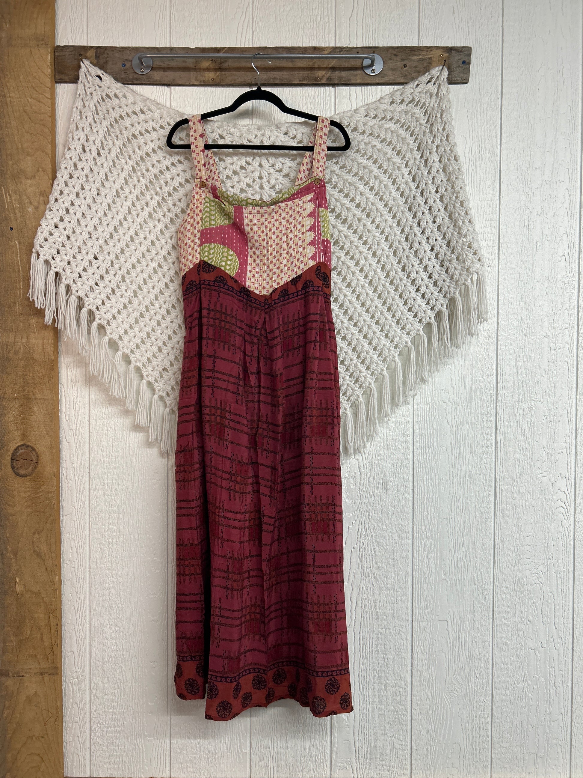 Perfect for EVERY season this overall dress features a kantha bib front with center pocket, adjustable button straps, tie back, crepe skirt and interior pockets on the skirt.