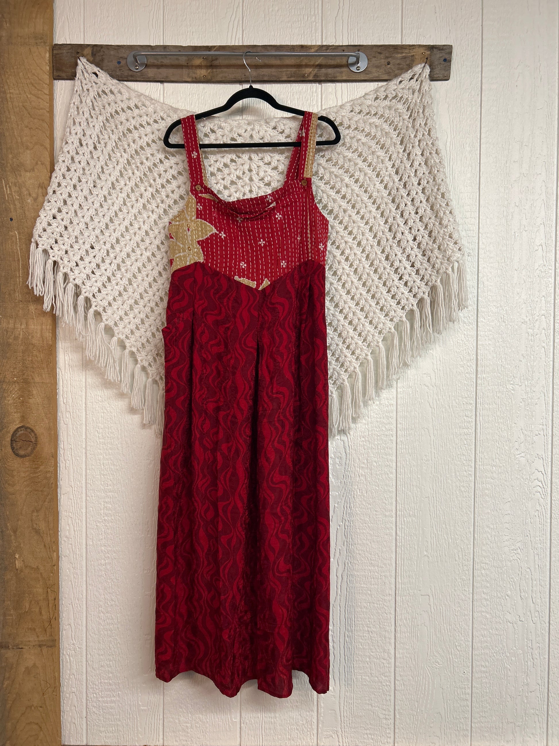 Perfect for EVERY season this overall dress features a kantha bib front with center pocket, adjustable button straps, tie back, crepe skirt and interior pockets on the skirt.
