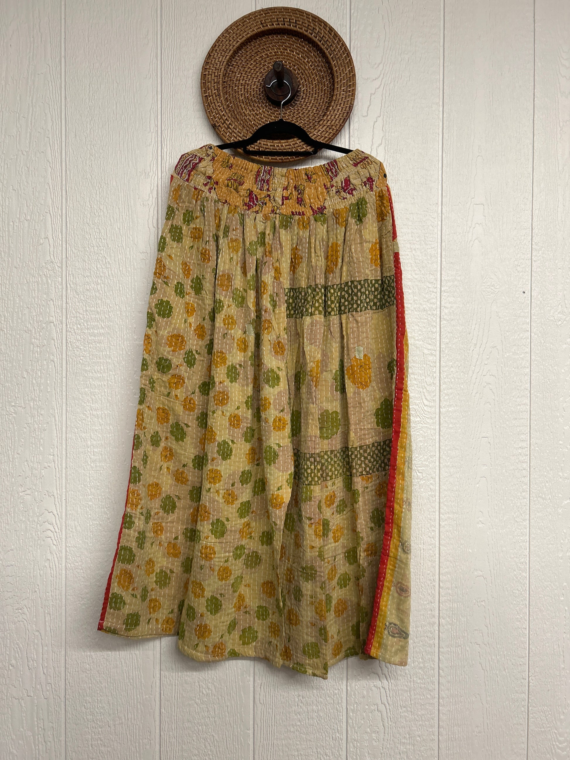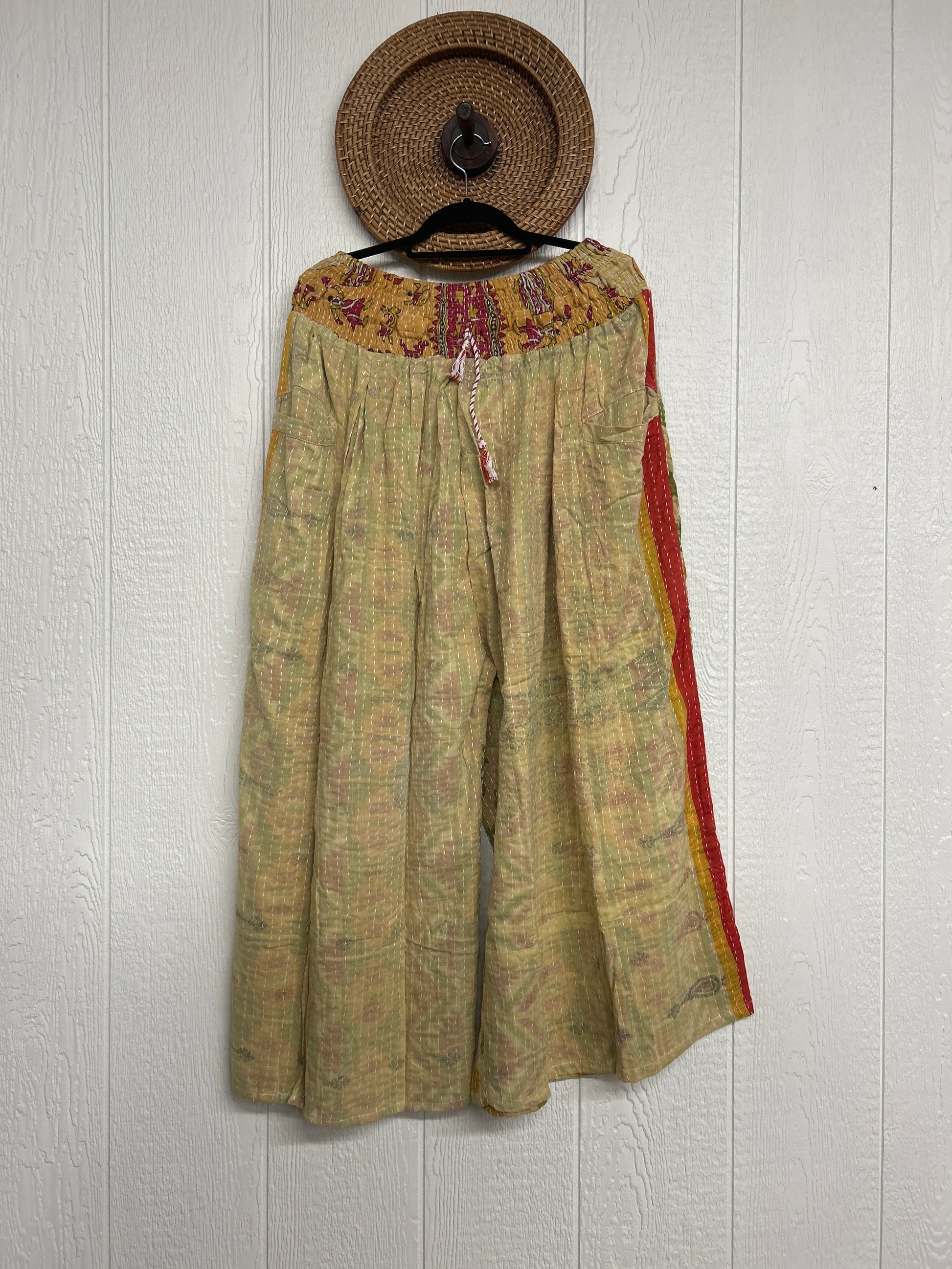 Crafted from vintage cotton kantha stitched sari these pants feature wide legs, pleating, interior pockets, and a stetchy waistband with a drawstring.