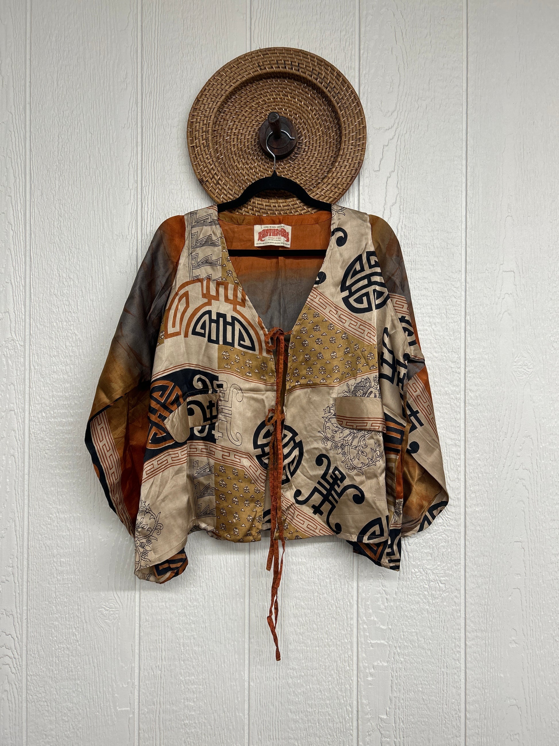 Crafted from our ultra lux crepe sari this dreamy piece features a vintage inspired floaty design with a double tie front closure and two pockets on the front panel.