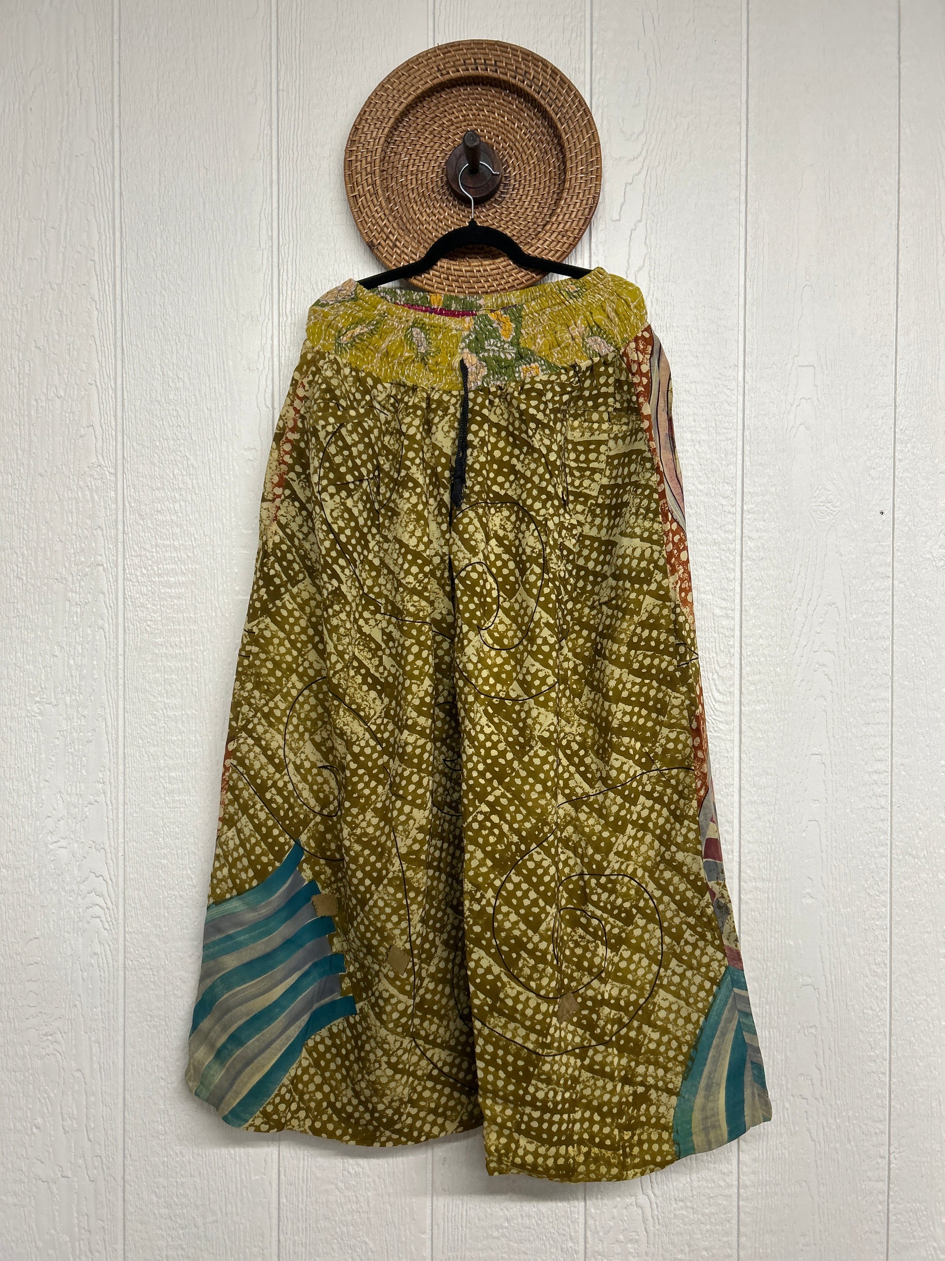 Crafted from vintage double crepe sari these pants feature wide legs, pleating, exterior and interior pockets making them fully reversible, and a stretchy waistband with a drawstring.