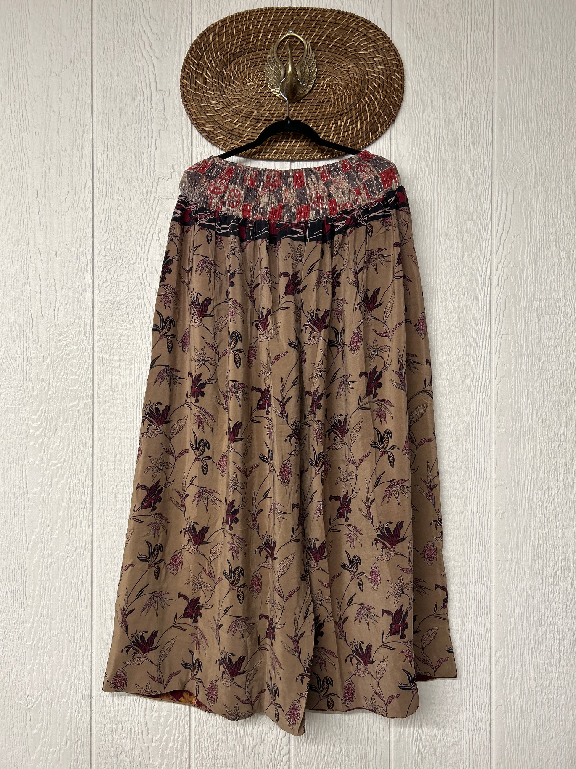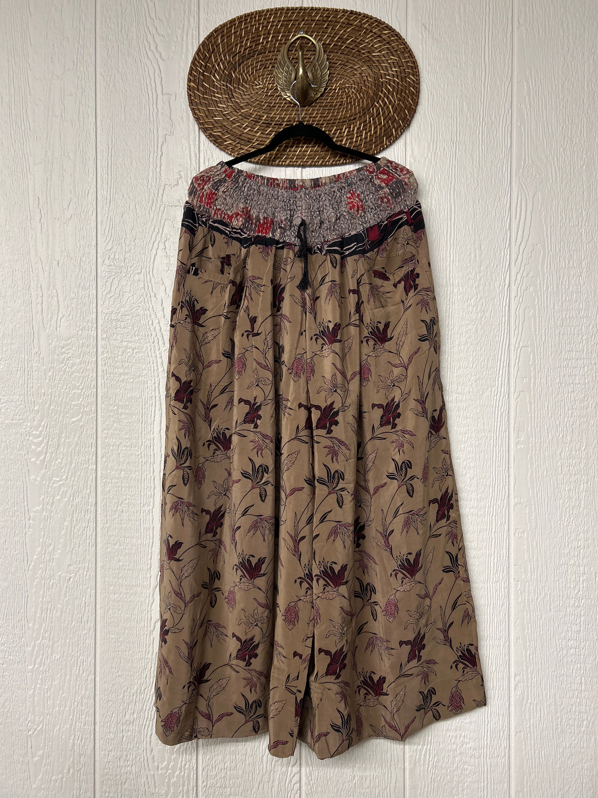 Crafted from vintage double crepe sari these pants feature wide legs, pleating, exterior and interior pockets making them fully reversible, and a stretchy waistband with a drawstring.