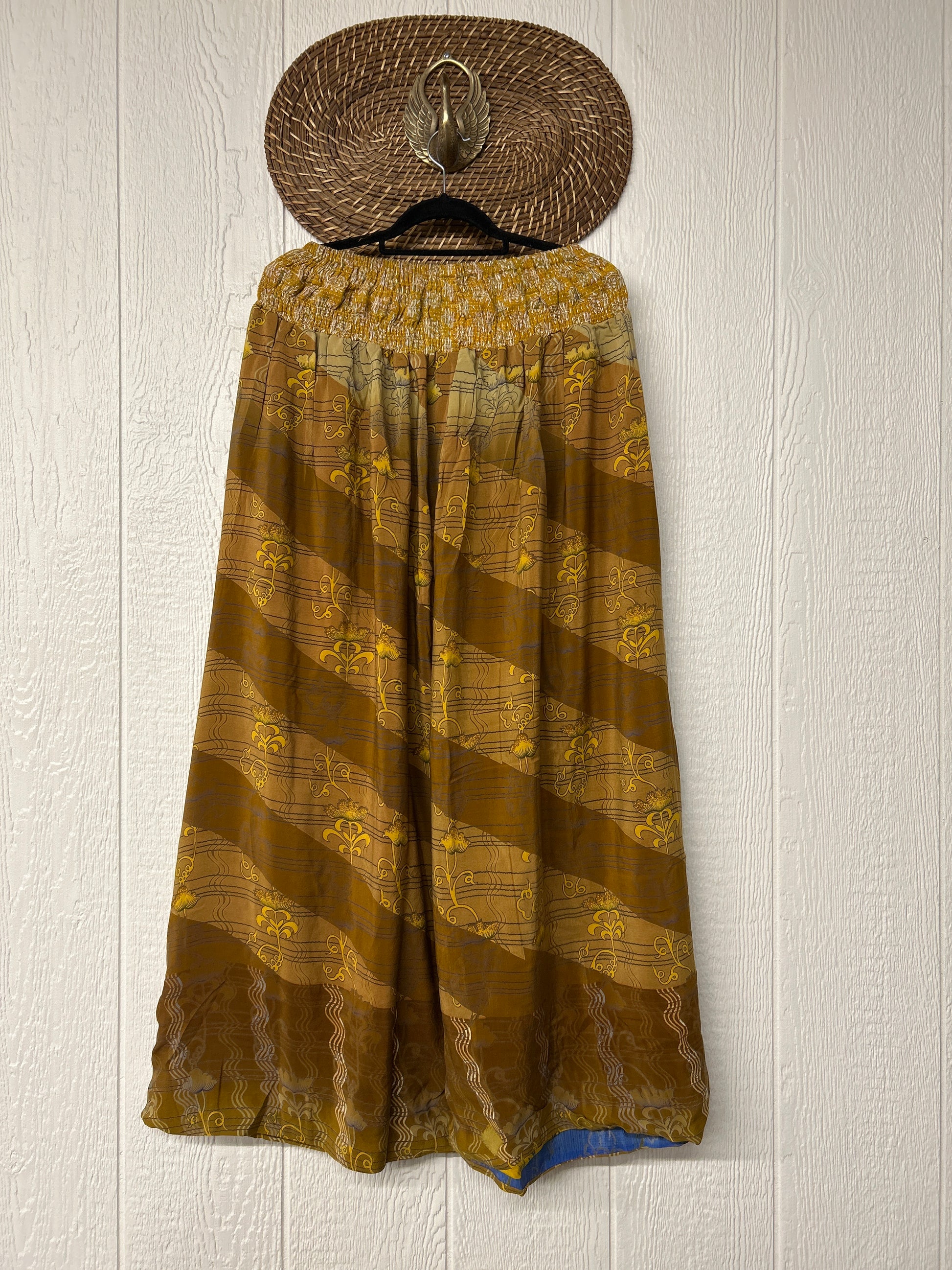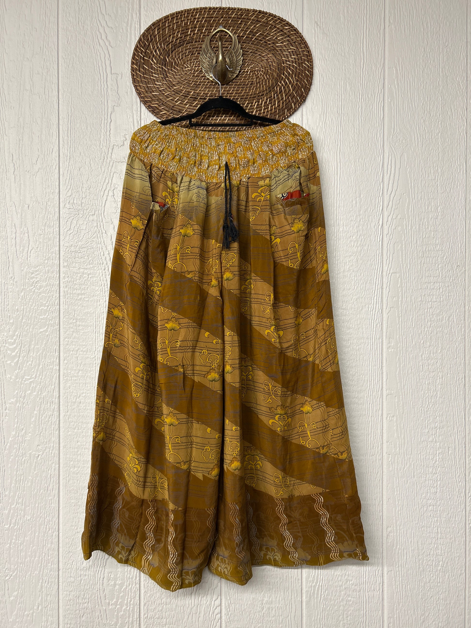 Crafted from vintage double crepe sari these pants feature wide legs, pleating, exterior and interior pockets making them fully reversible, and a stretchy waistband with a drawstring.