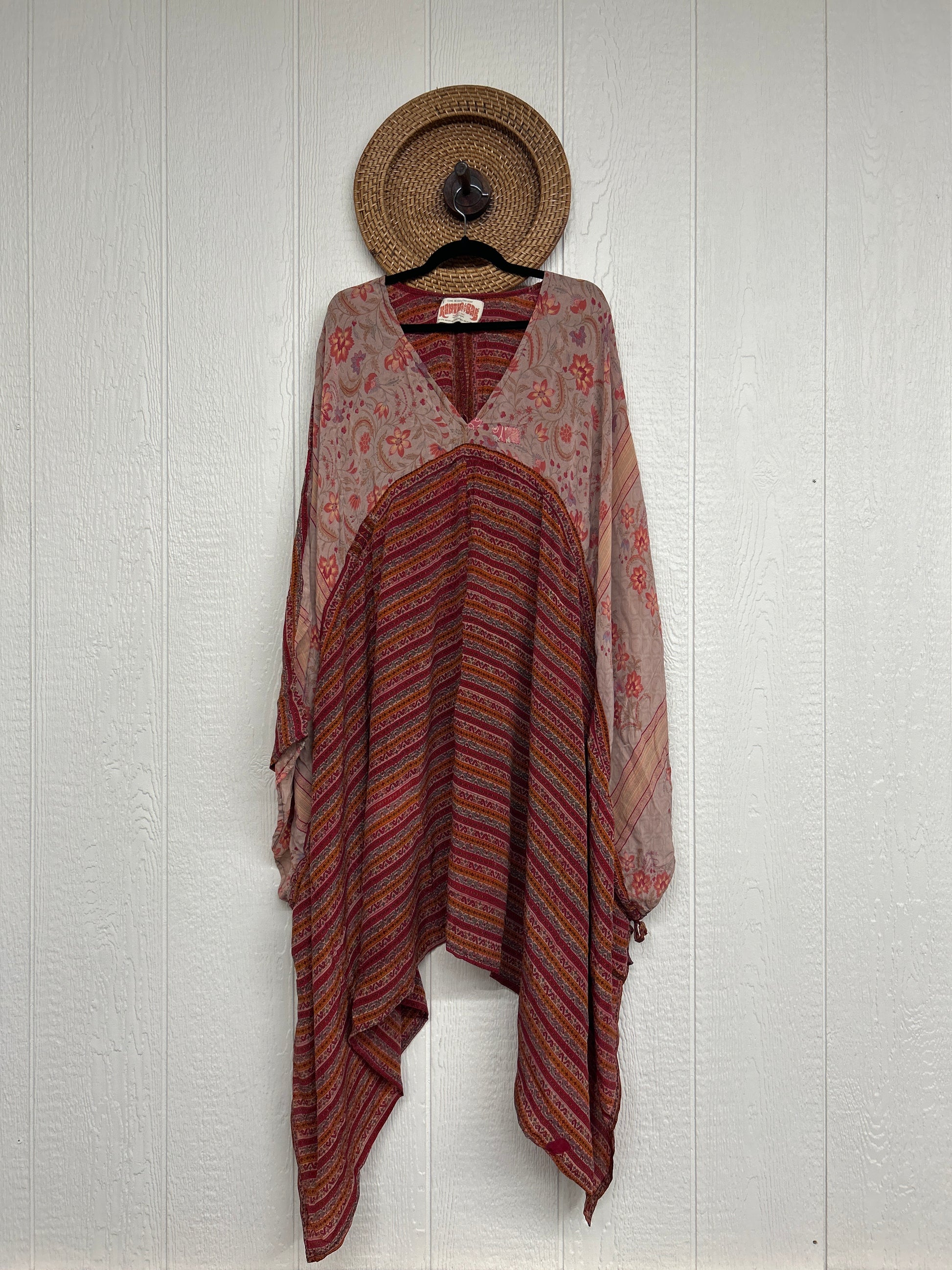 Fabrics may have small threads or holes in the layers. Color inconsistency or small stains may be present. The saris are sewn together and extend the life of each design.