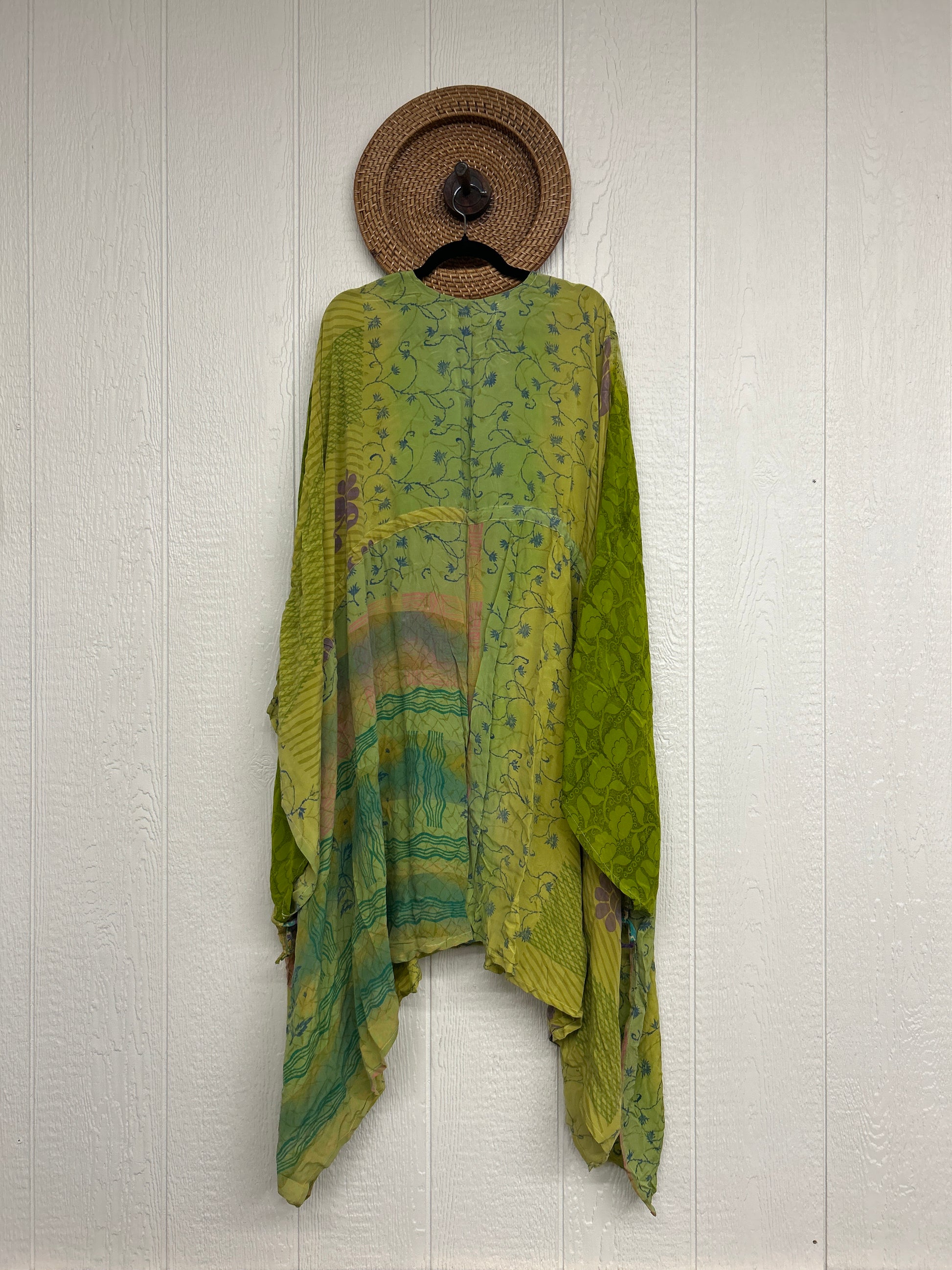 Fabrics may have small threads or holes in the layers. Color inconsistency or small stains may be present. The saris are sewn together and extend the life of each design.