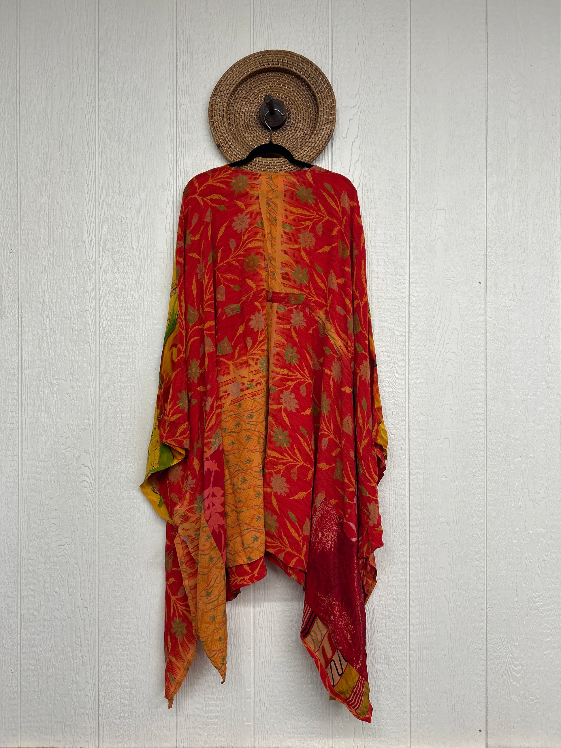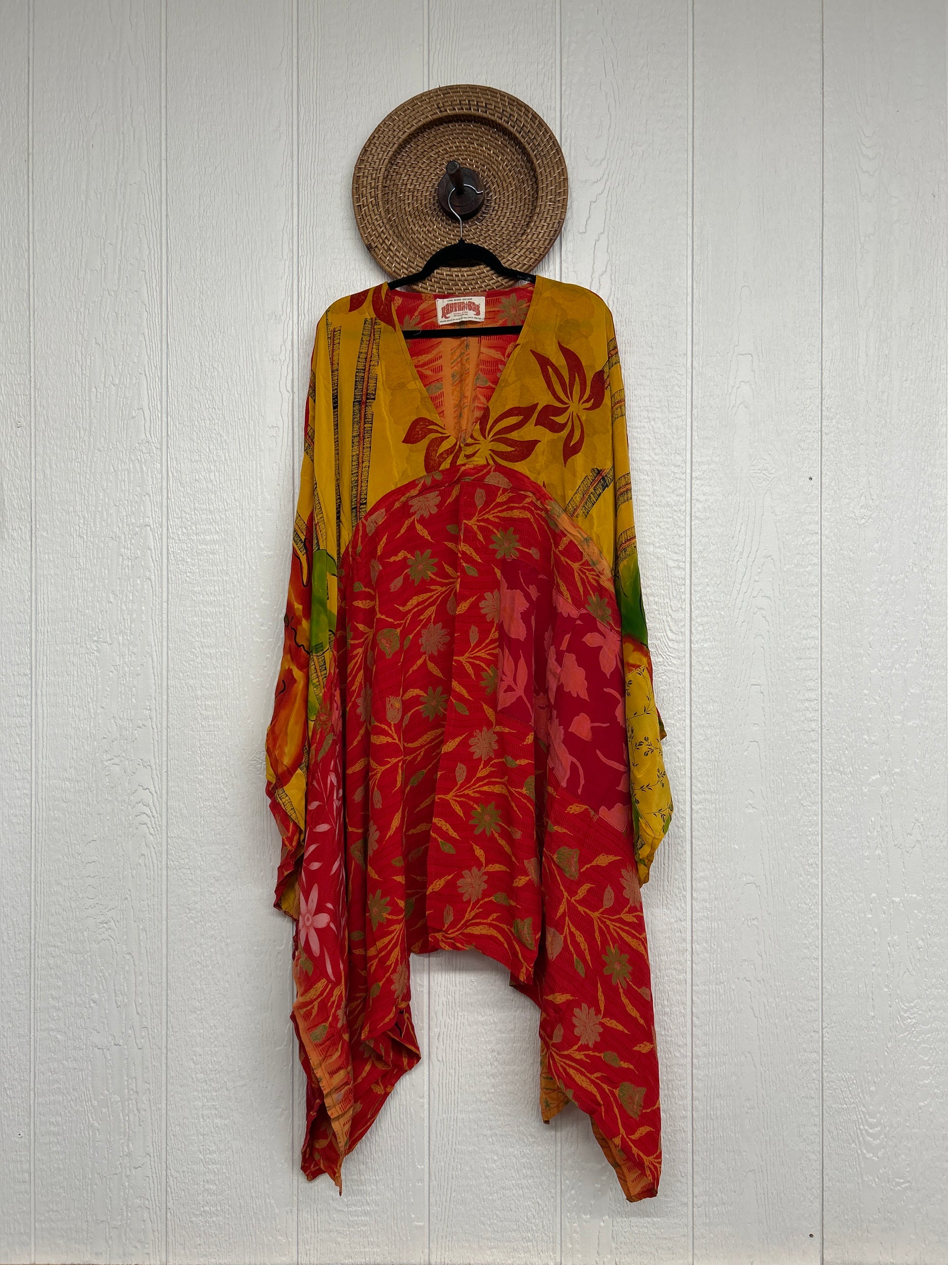 Fabrics may have small threads or holes in the layers. Color inconsistency or small stains may be present. The saris are sewn together and extend the life of each design.