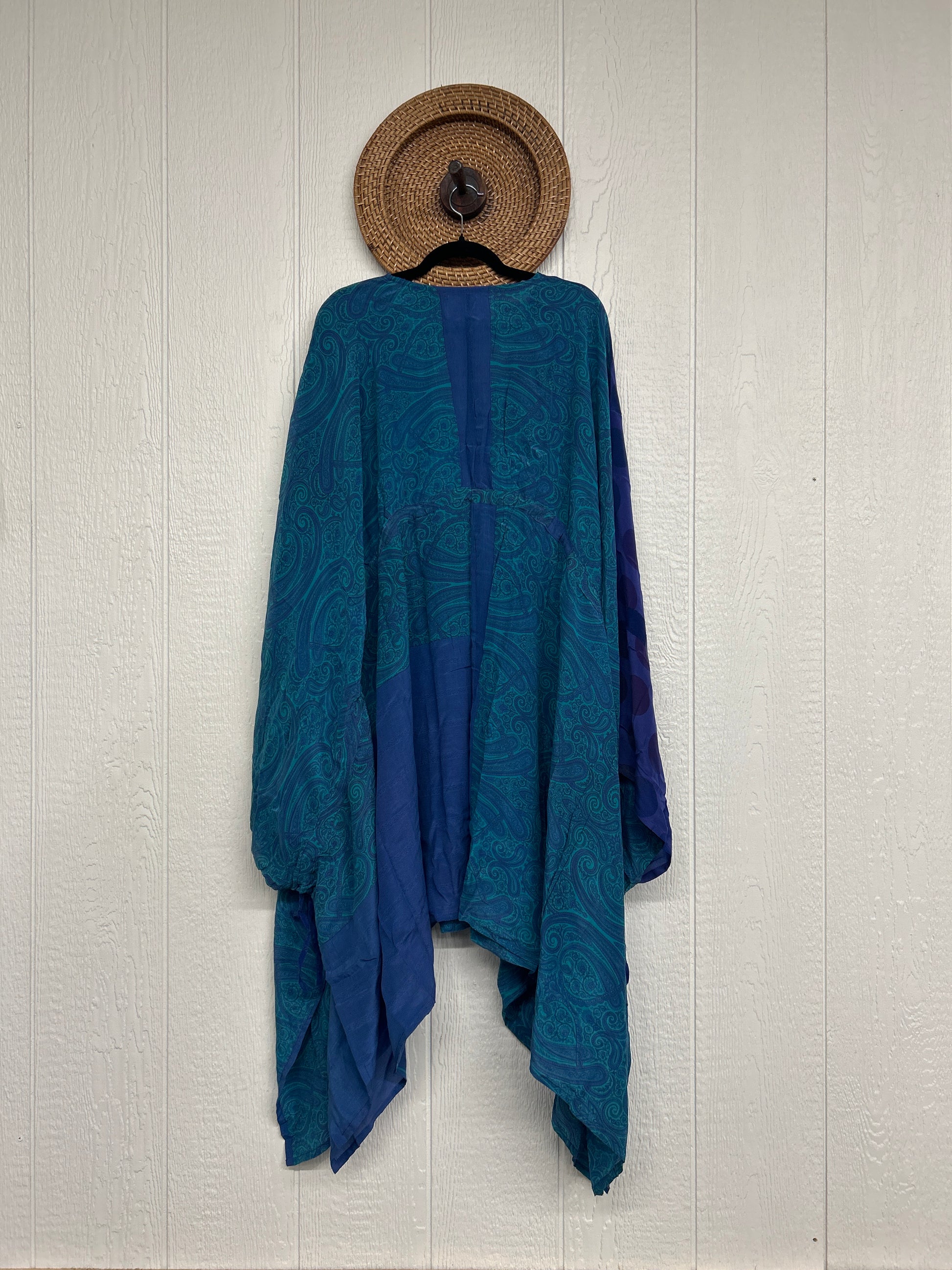 Fabrics may have small threads or holes in the layers. Color inconsistency or small stains may be present. The saris are sewn together and extend the life of each design.