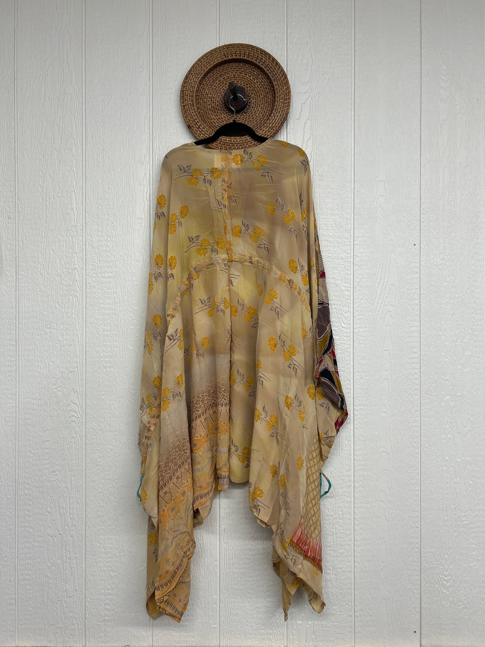 Fabrics may have small threads or holes in the layers. Color inconsistency or small stains may be present. The saris are sewn together and extend the life of each design.