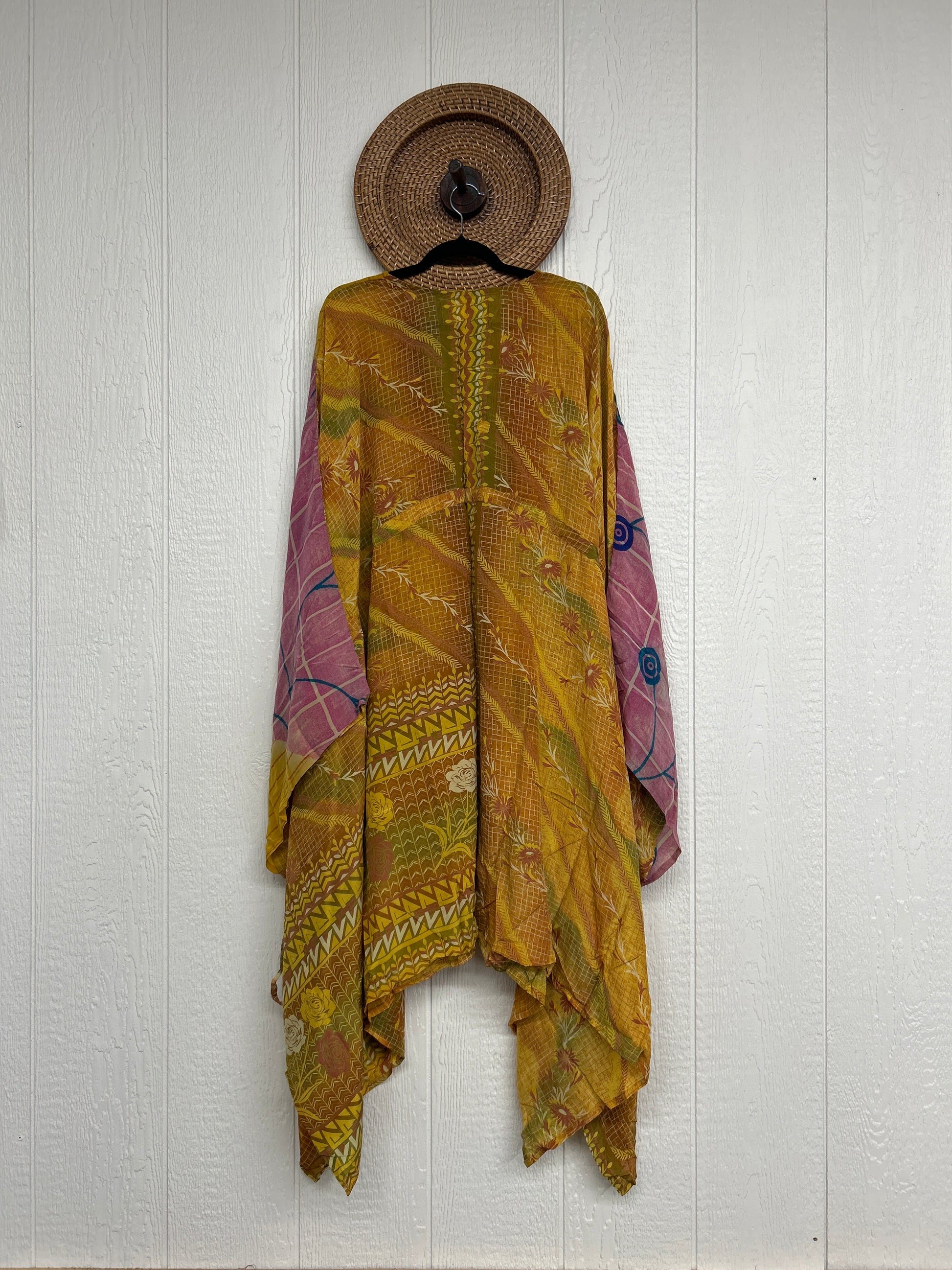 Fabrics may have small threads or holes in the layers. Color inconsistency or small stains may be present. The saris are sewn together and extend the life of each design.