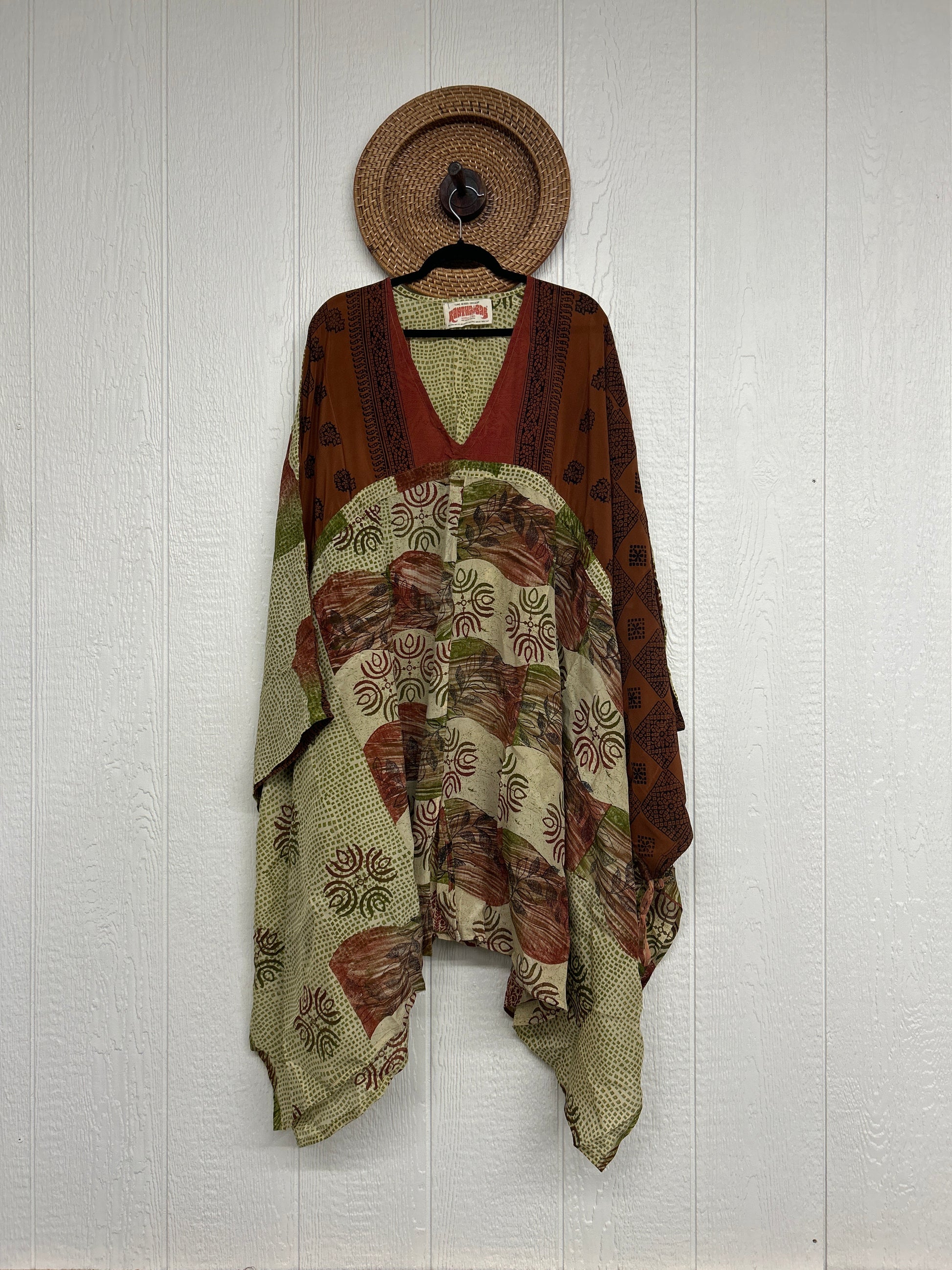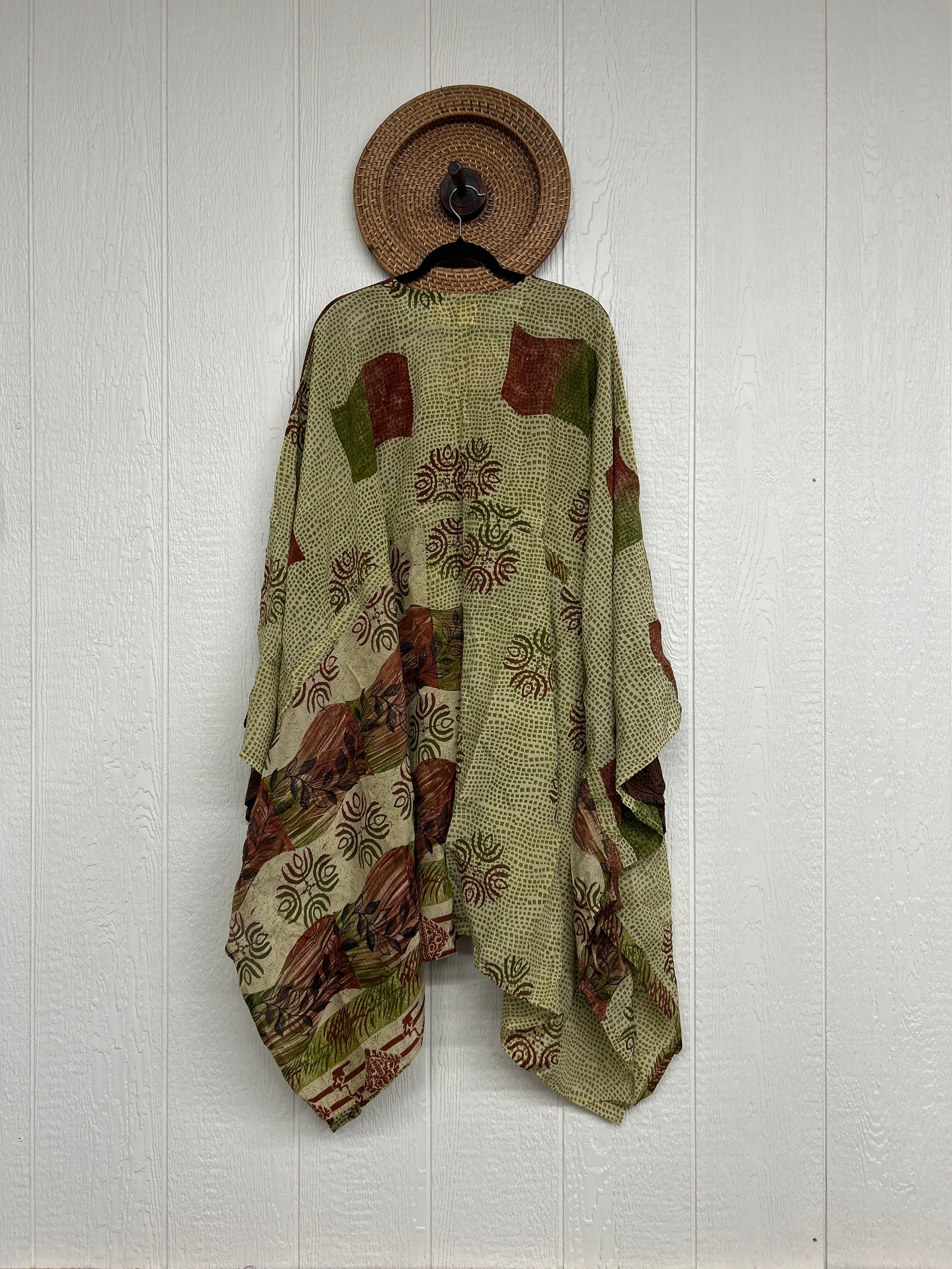 Fabrics may have small threads or holes in the layers. Color inconsistency or small stains may be present. The saris are sewn together and extend the life of each design.