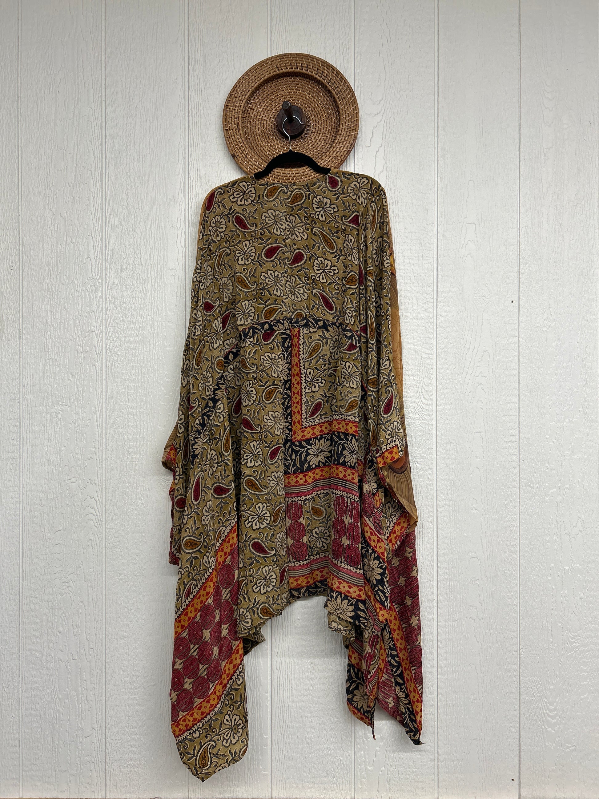 Fabrics may have small threads or holes in the layers. Color inconsistency or small stains may be present. The saris are sewn together and extend the life of each design.