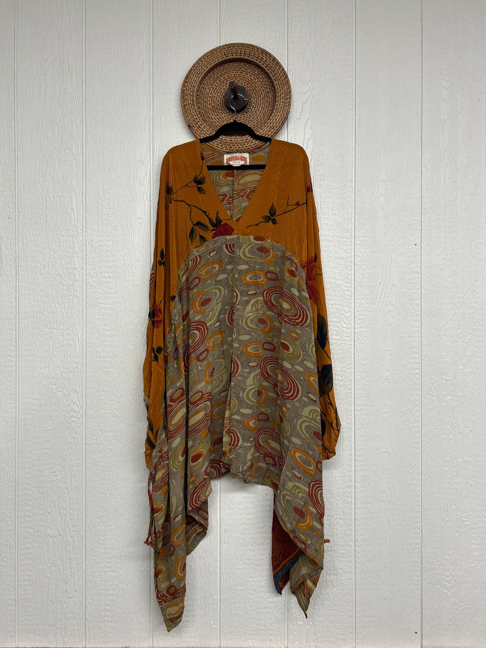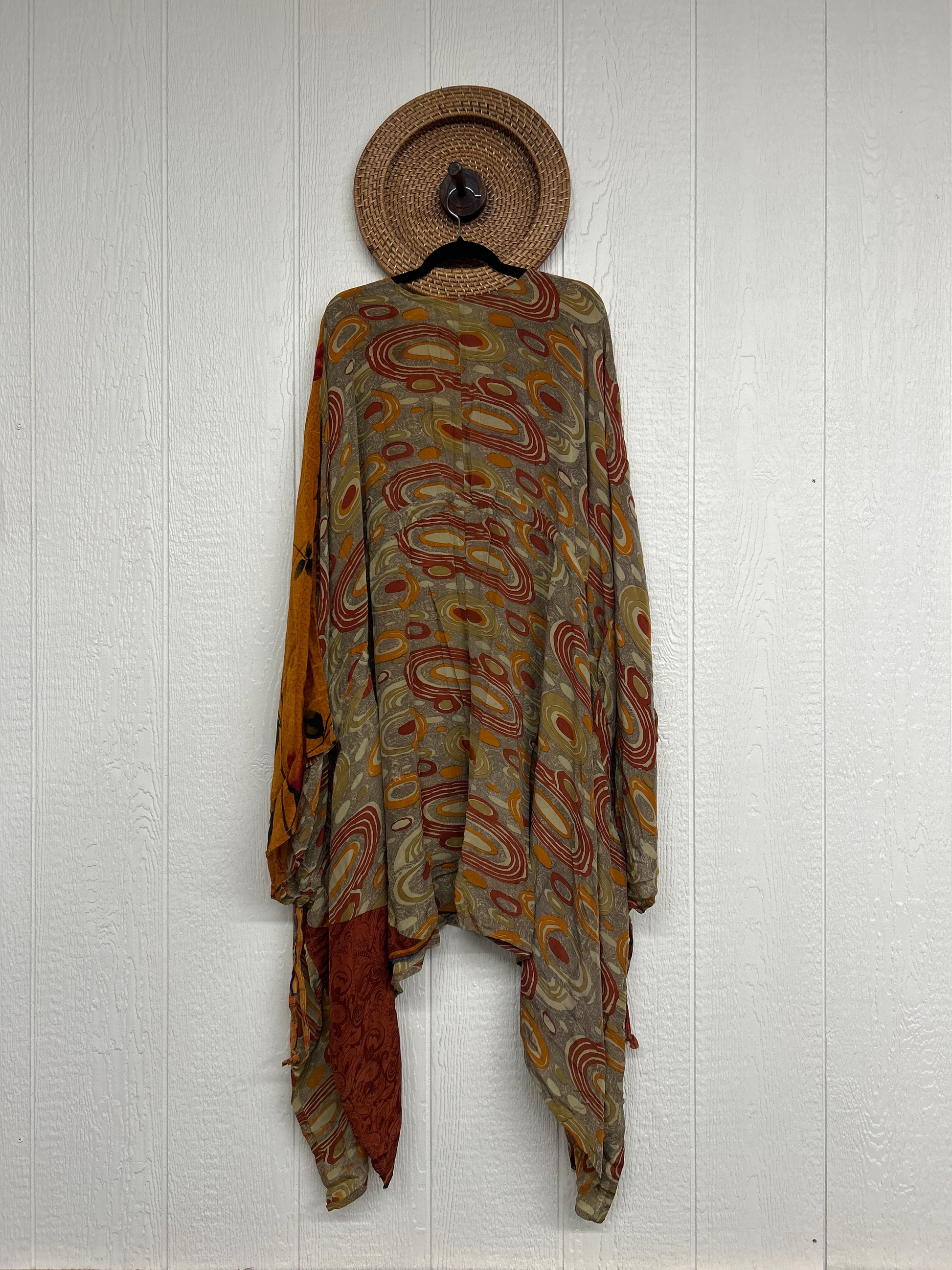 Fabrics may have small threads or holes in the layers. Color inconsistency or small stains may be present. The saris are sewn together and extend the life of each design.