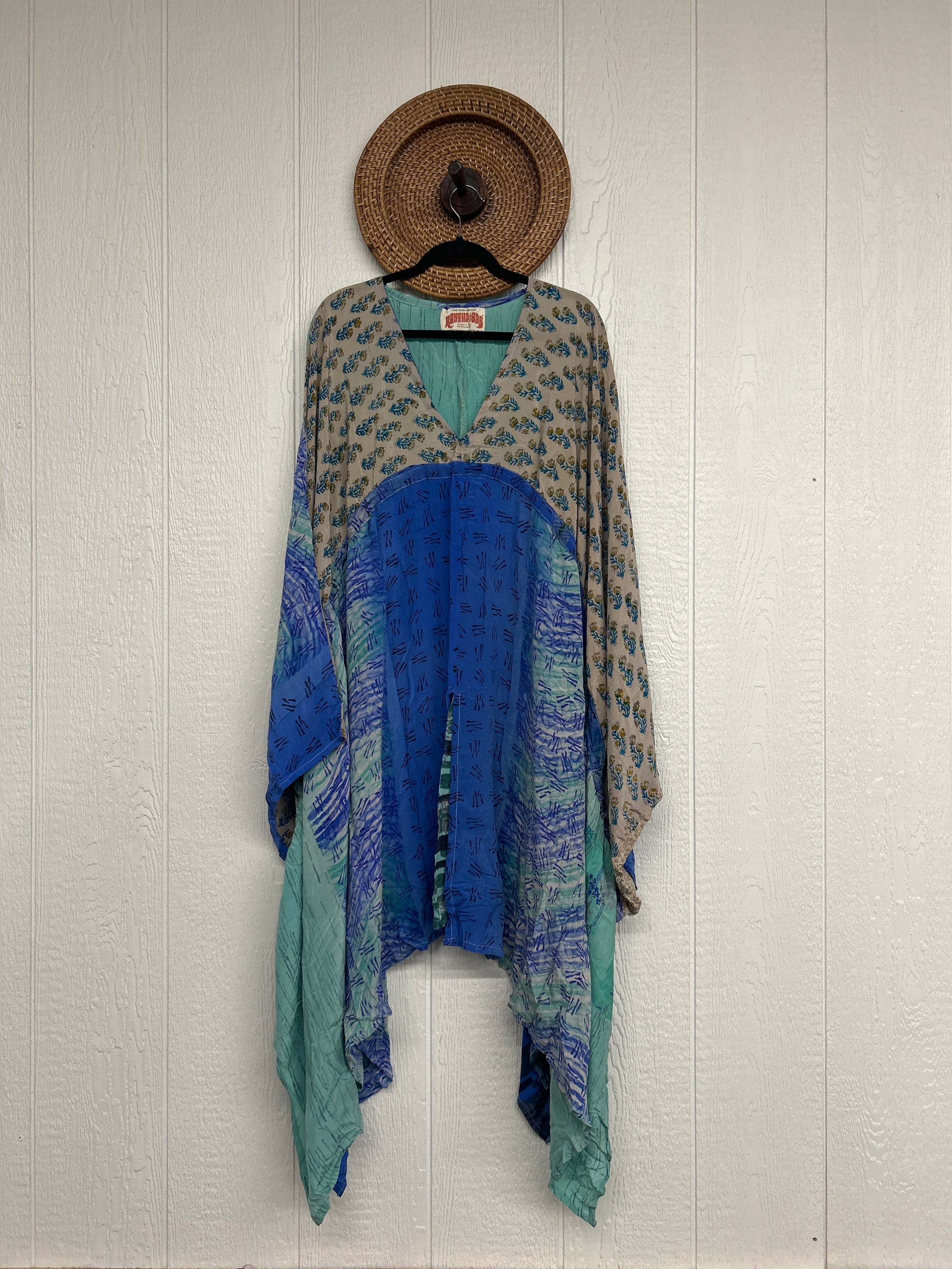 Fabrics may have small threads or holes in the layers. Color inconsistency or small stains may be present. The saris are sewn together and extend the life of each design.
