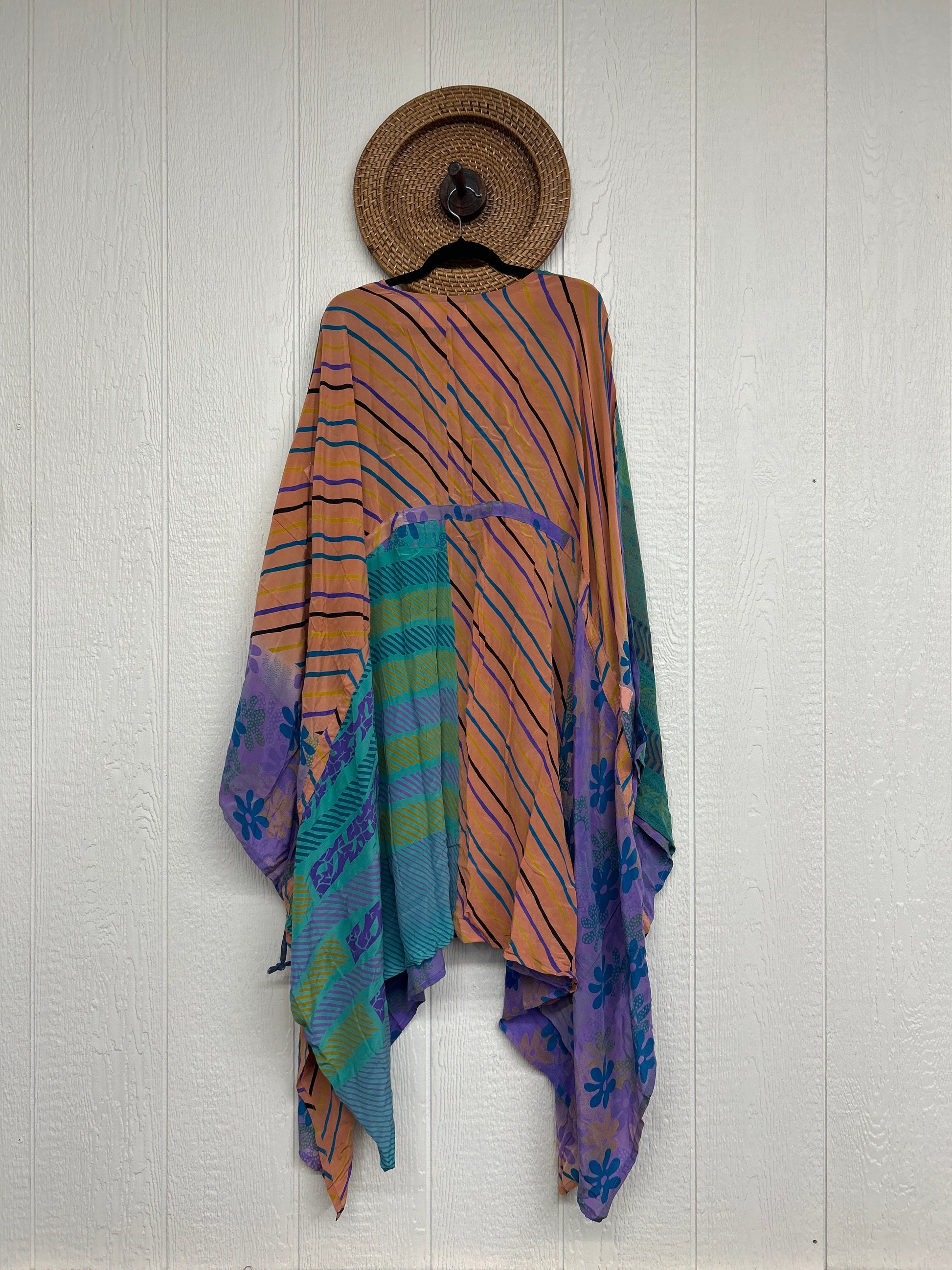 Fabrics may have small threads or holes in the layers. Color inconsistency or small stains may be present. The saris are sewn together and extend the life of each design.