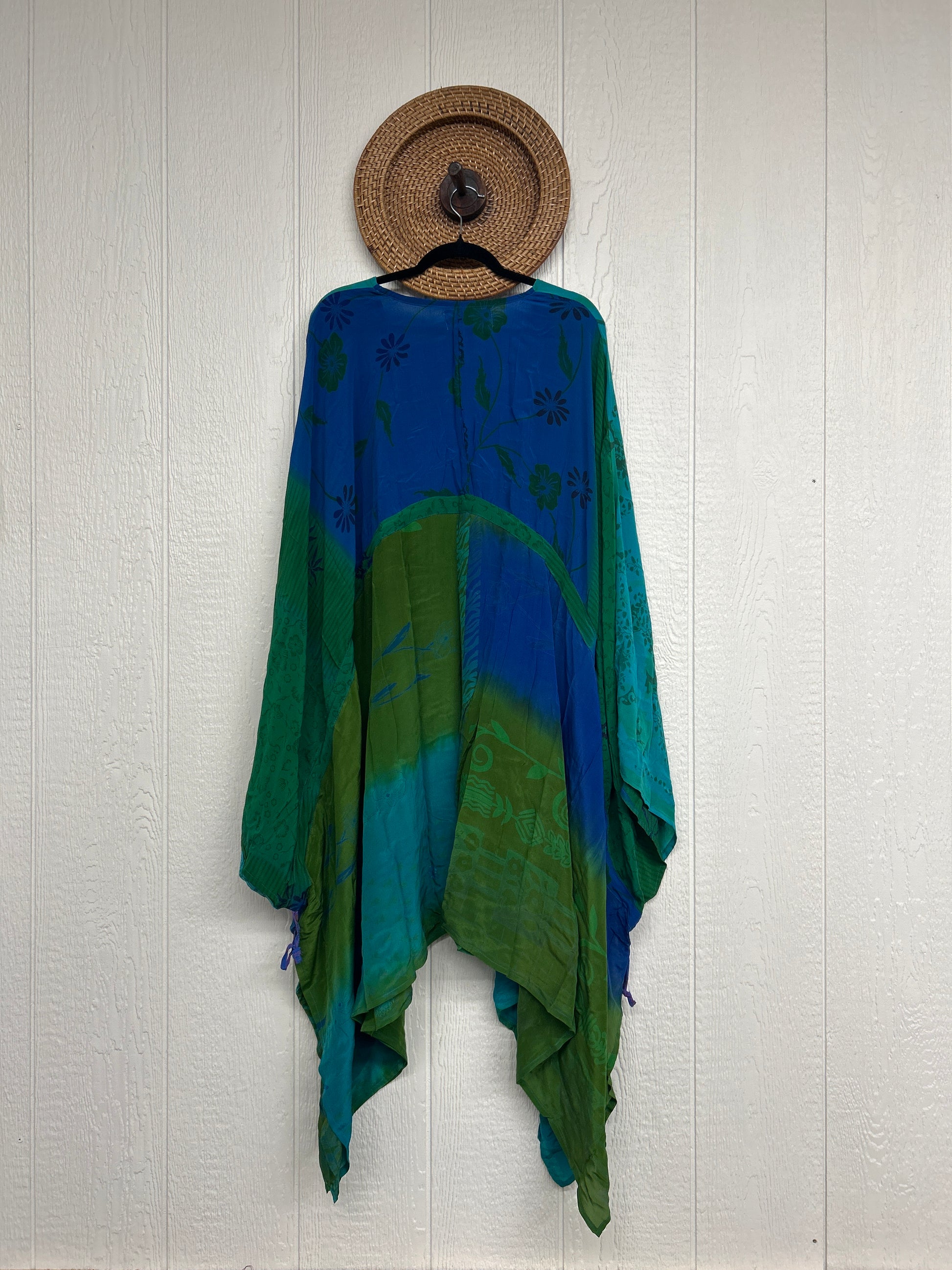 Fabrics may have small threads or holes in the layers. Color inconsistency or small stains may be present. The saris are sewn together and extend the life of each design.