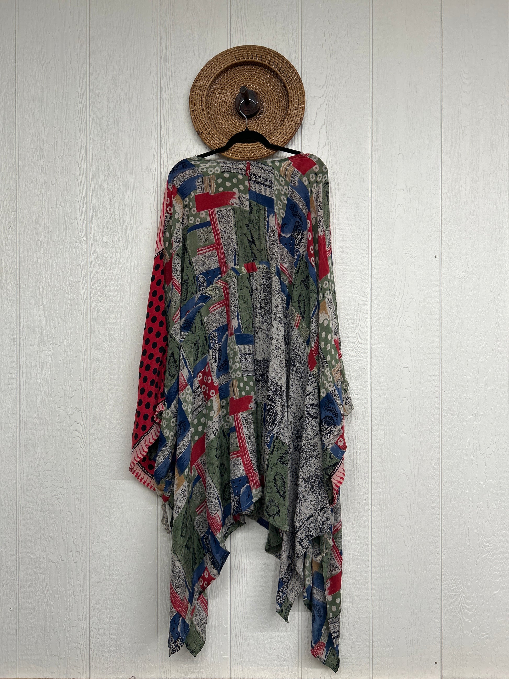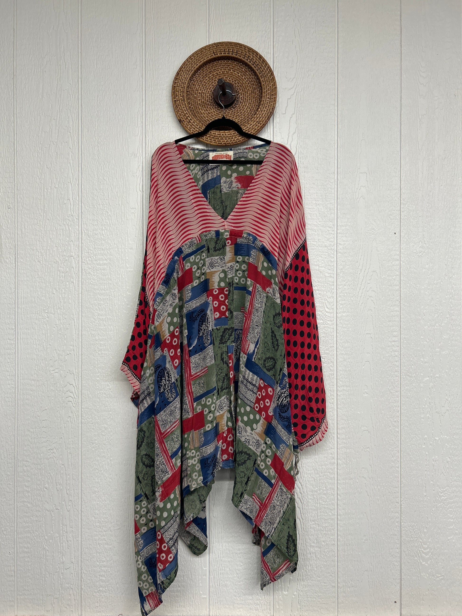 Fabrics may have small threads or holes in the layers. Color inconsistency or small stains may be present. The saris are sewn together and extend the life of each design.