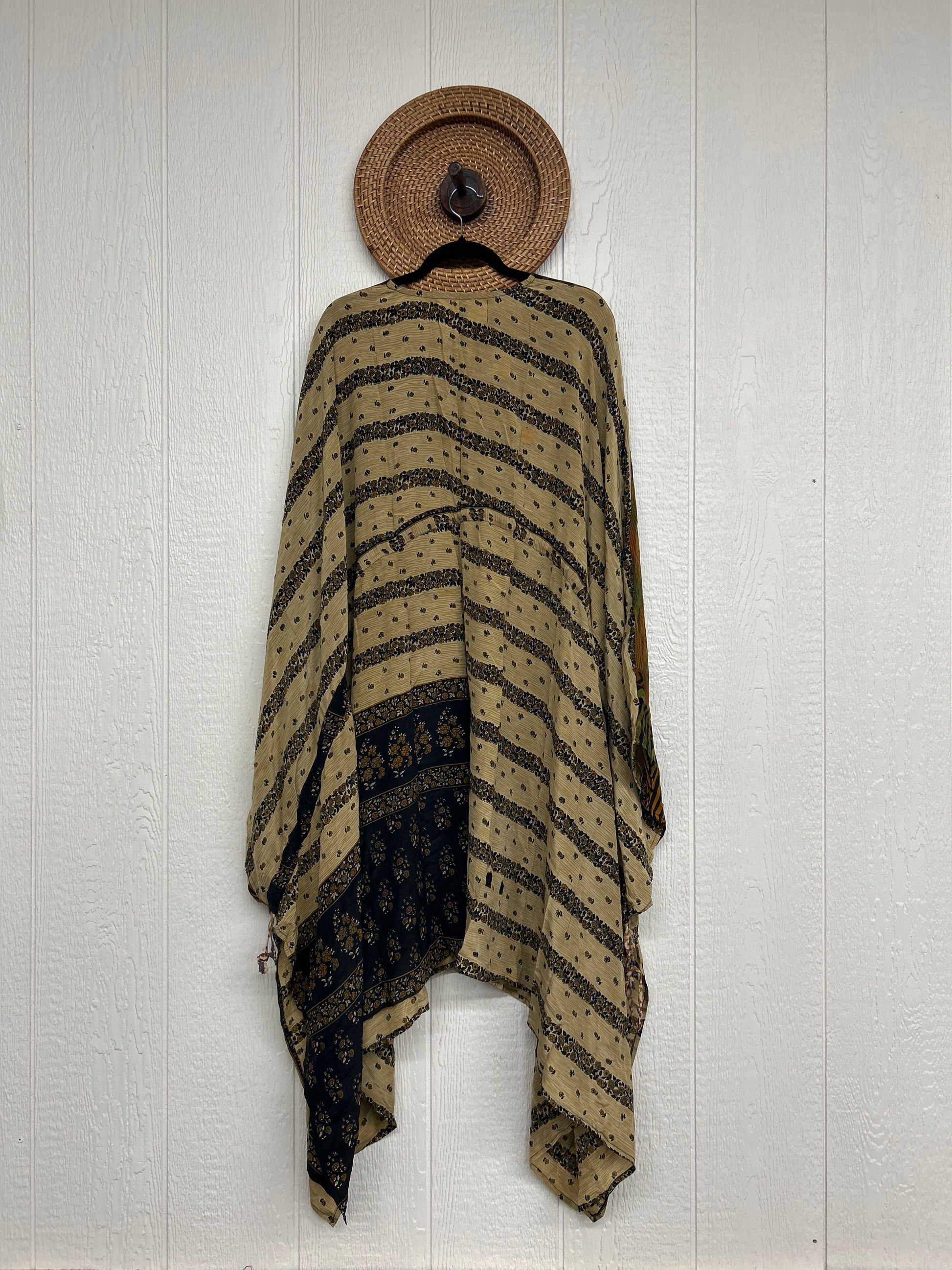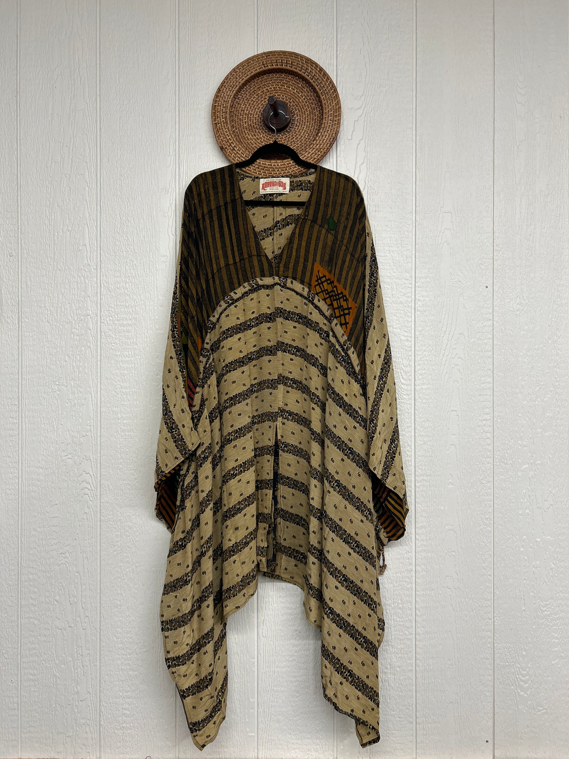 Fabrics may have small threads or holes in the layers. Color inconsistency or small stains may be present. The saris are sewn together and extend the life of each design.
