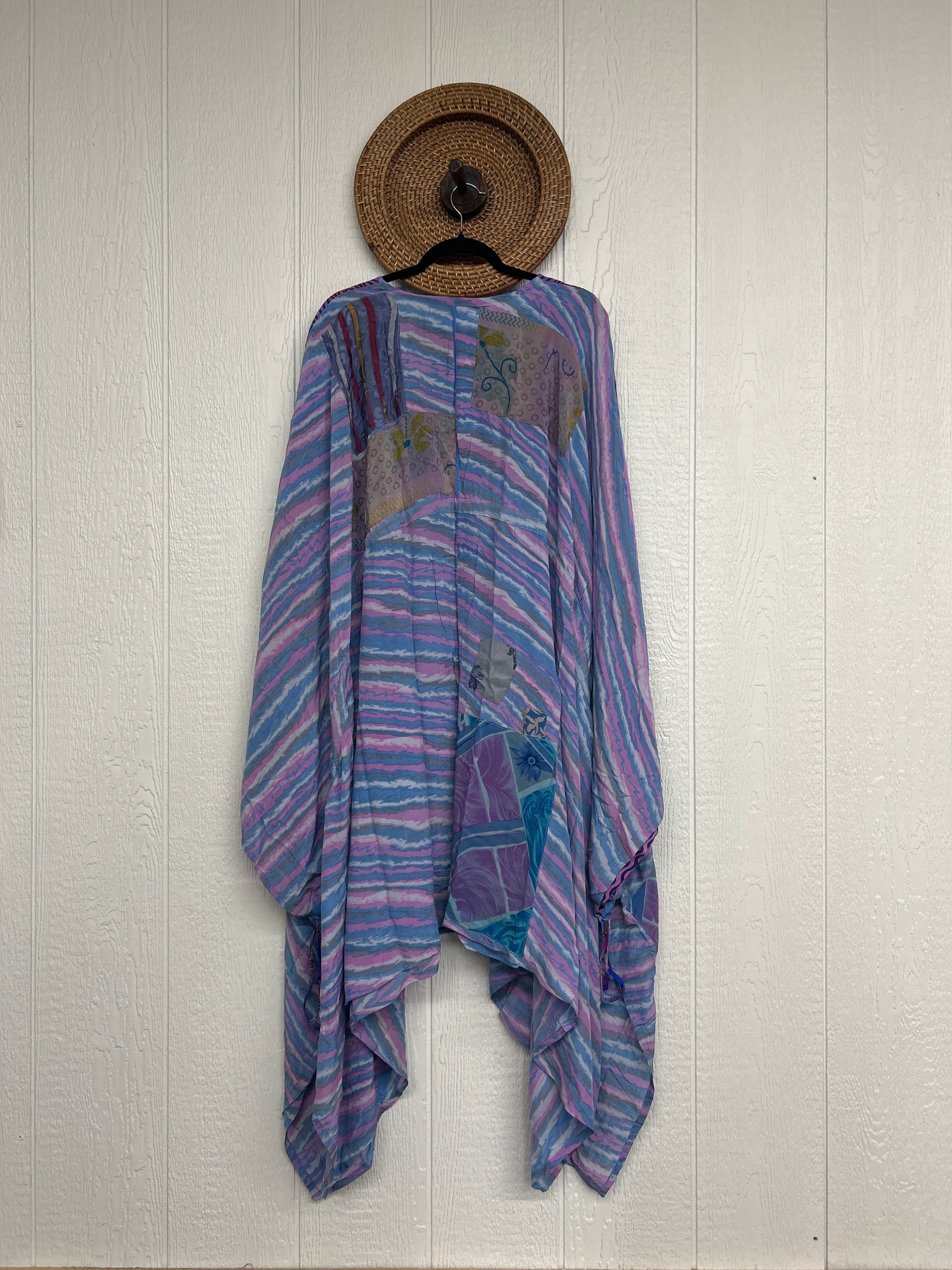 Fabrics may have small threads or holes in the layers. Color inconsistency or small stains may be present. The saris are sewn together and extend the life of each design.