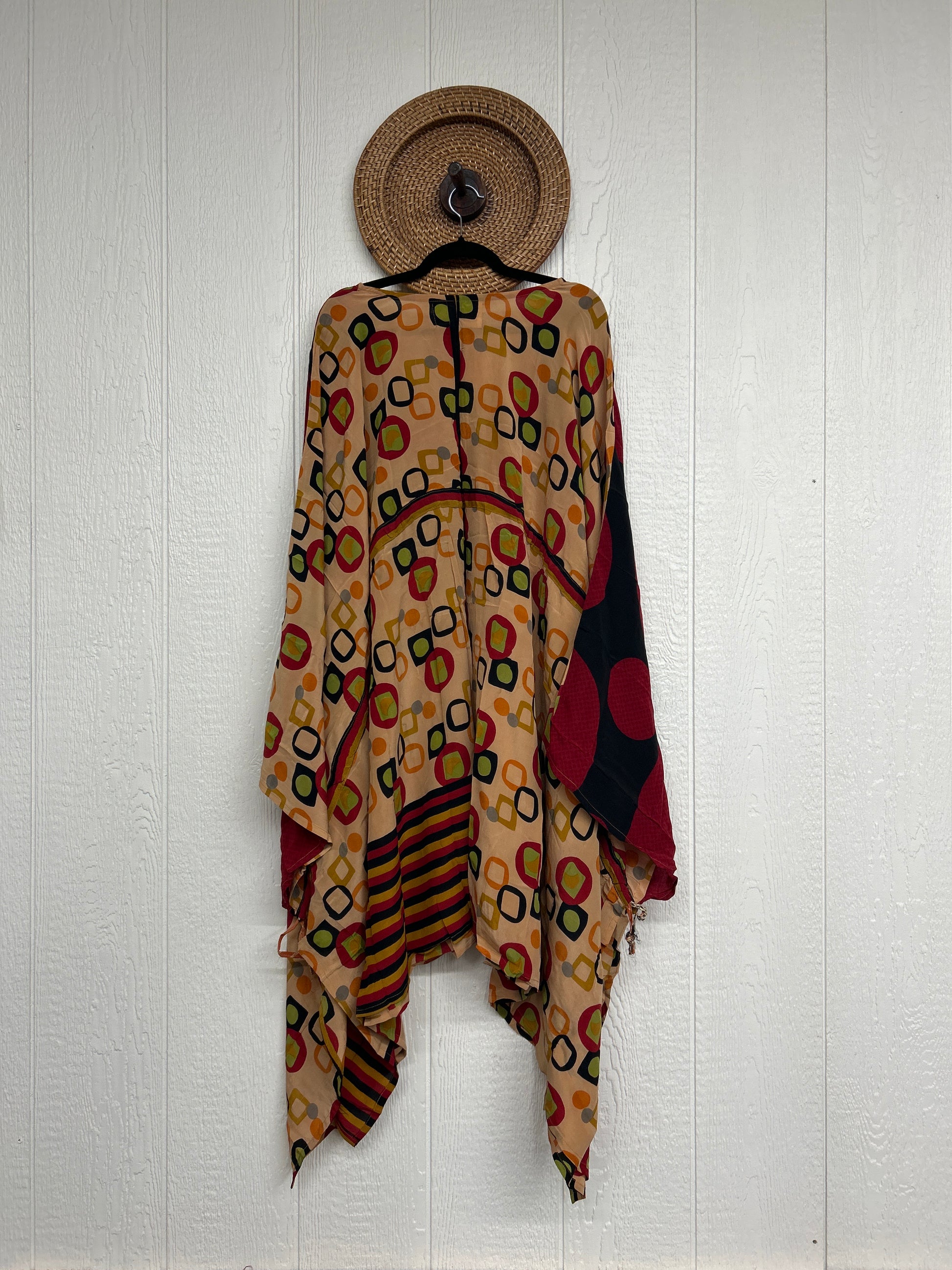 Fabrics may have small threads or holes in the layers. Color inconsistency or small stains may be present. The saris are sewn together and extend the life of each design.