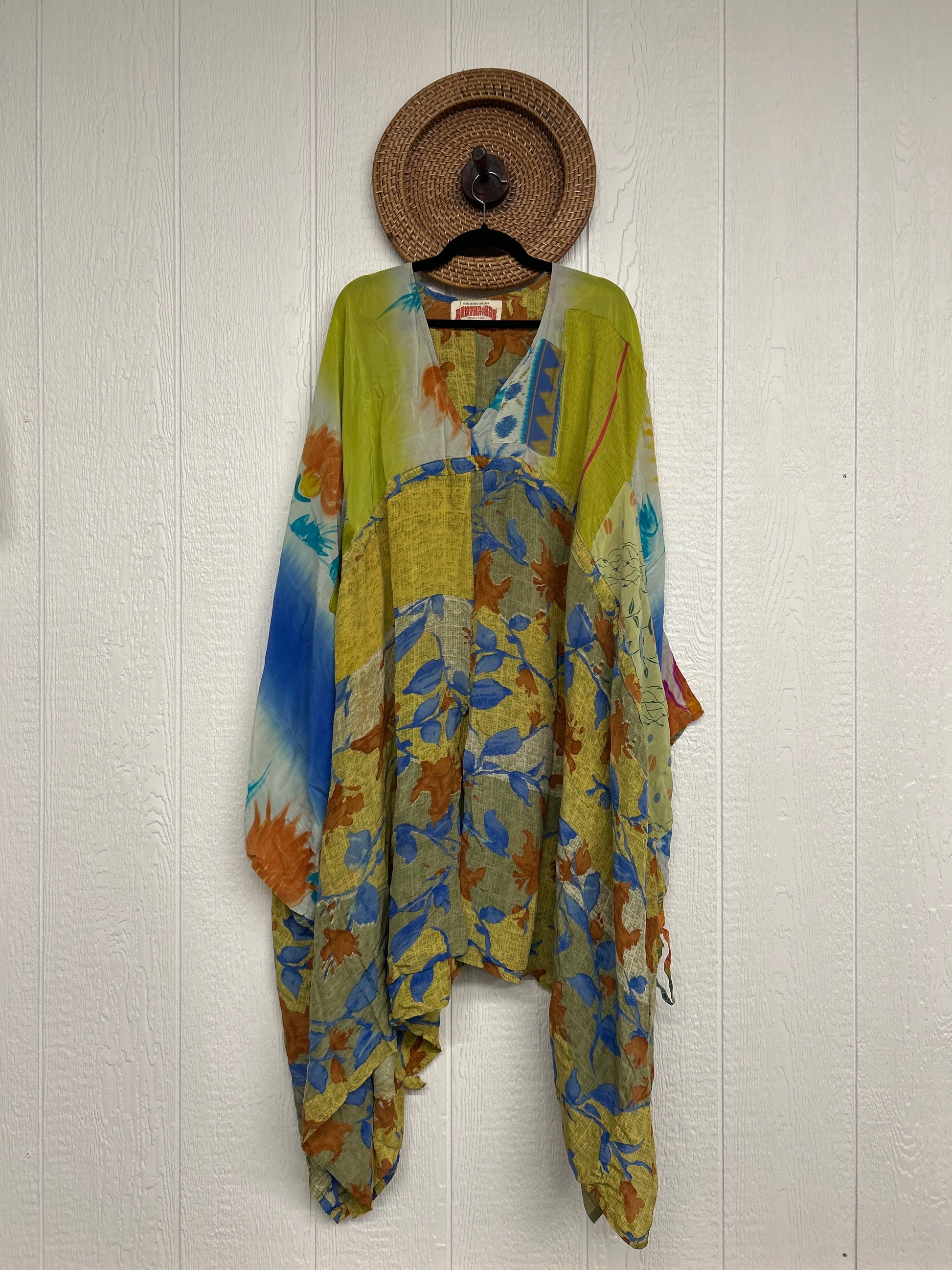 Fabrics may have small threads or holes in the layers. Color inconsistency or small stains may be present. The saris are sewn together and extend the life of each design.
