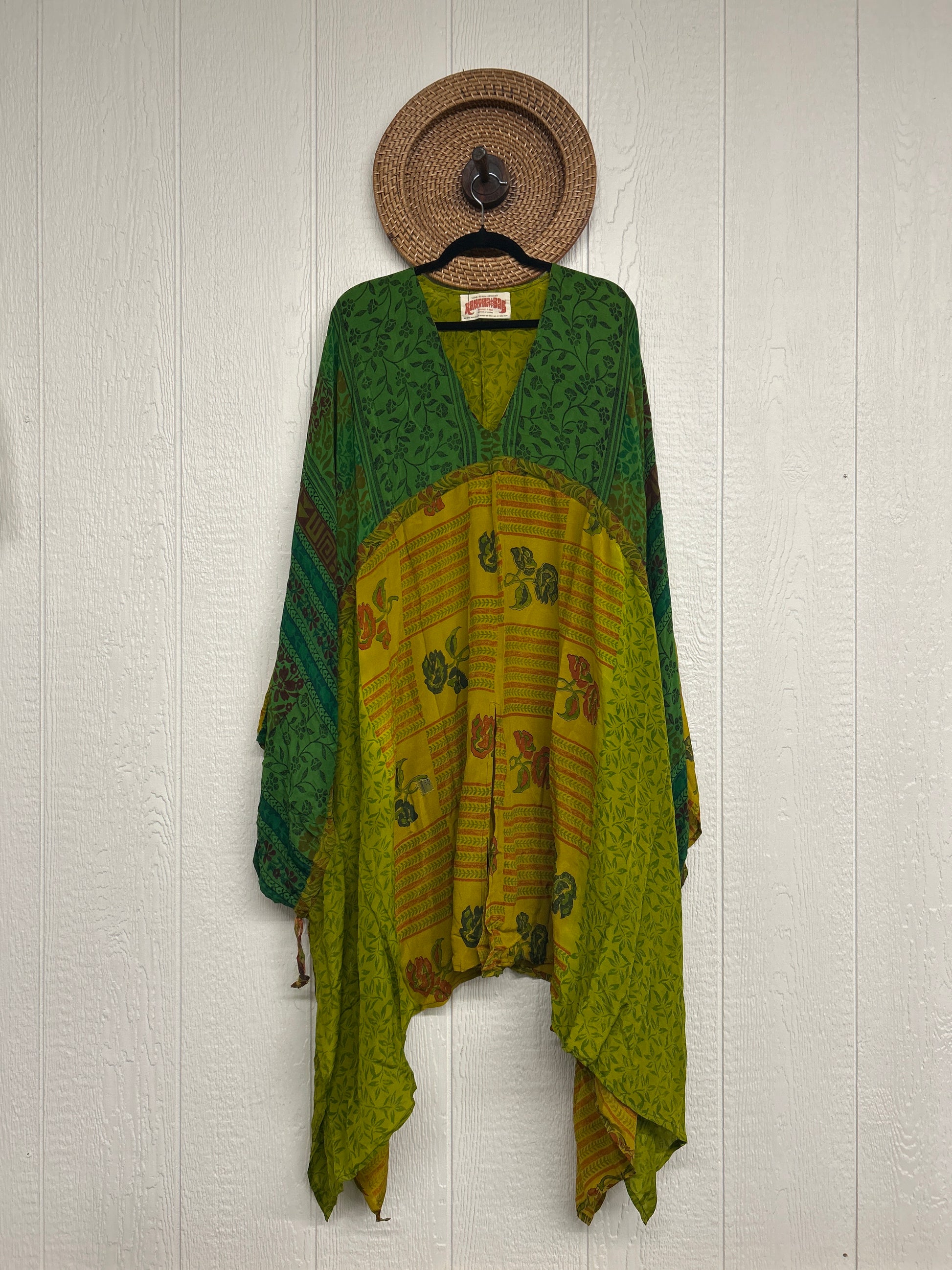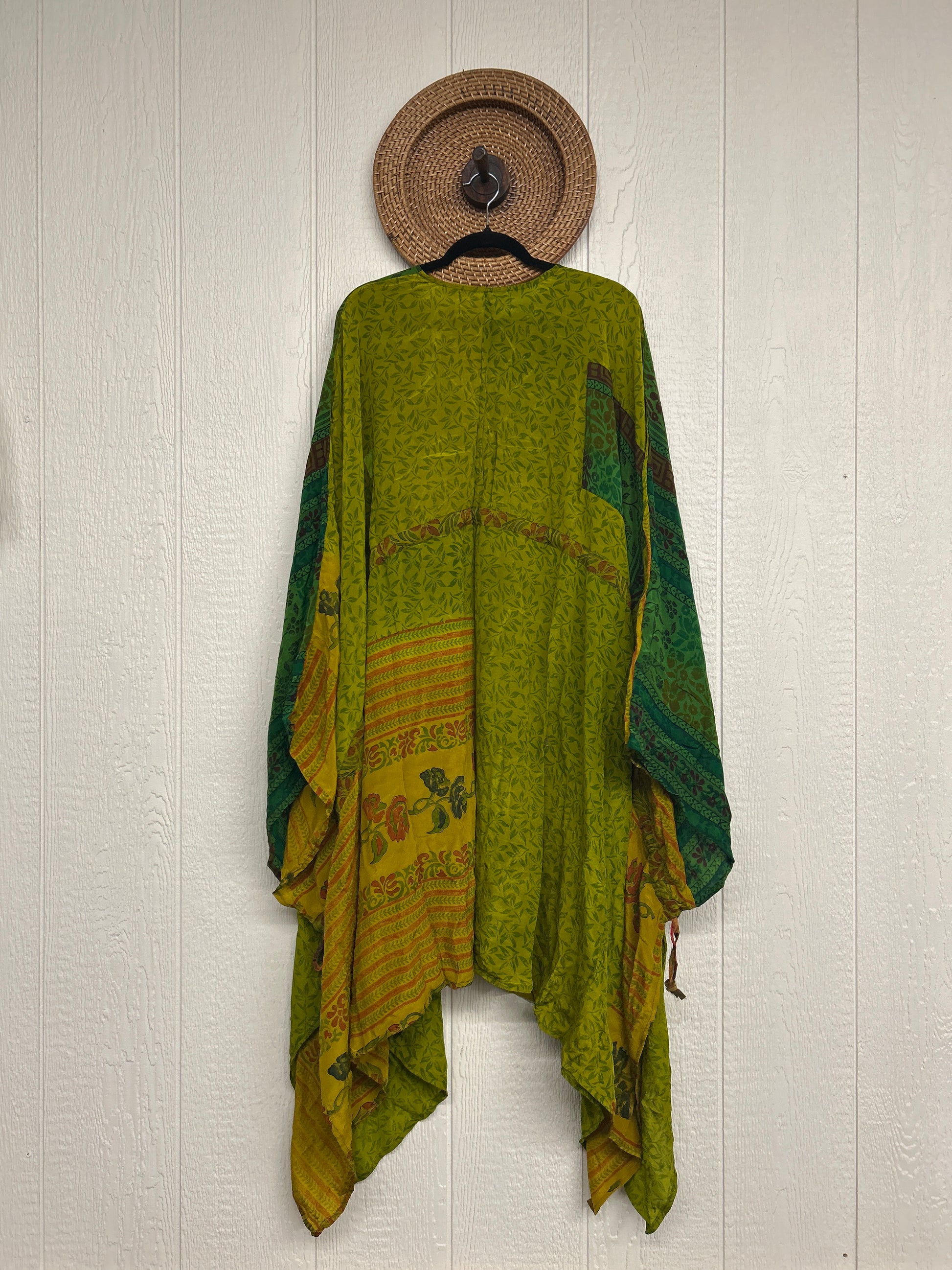 Fabrics may have small threads or holes in the layers. Color inconsistency or small stains may be present. The saris are sewn together and extend the life of each design.