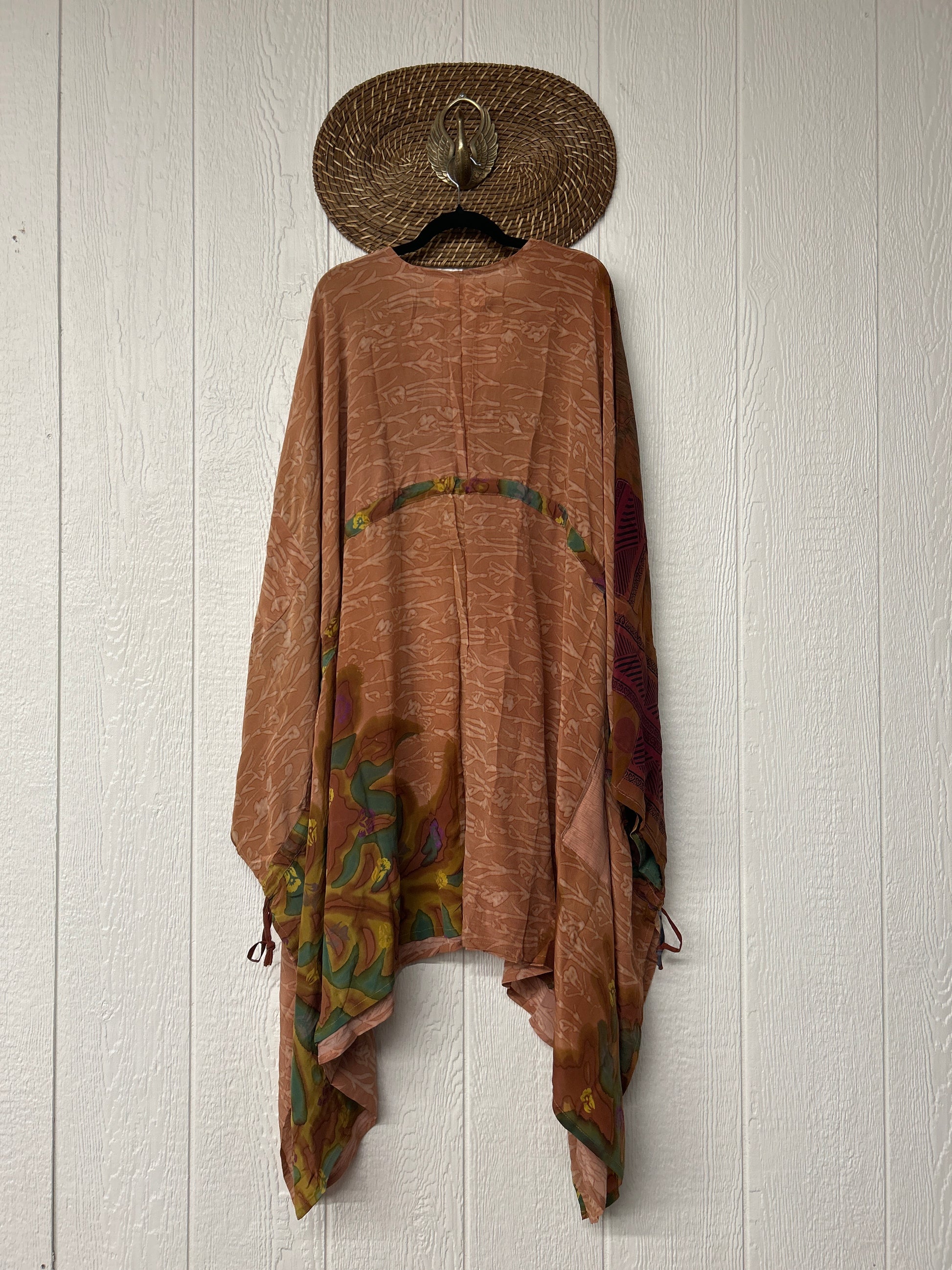 Fabrics may have small threads or holes in the layers. Color inconsistency or small stains may be present. The saris are sewn together and extend the life of each design.