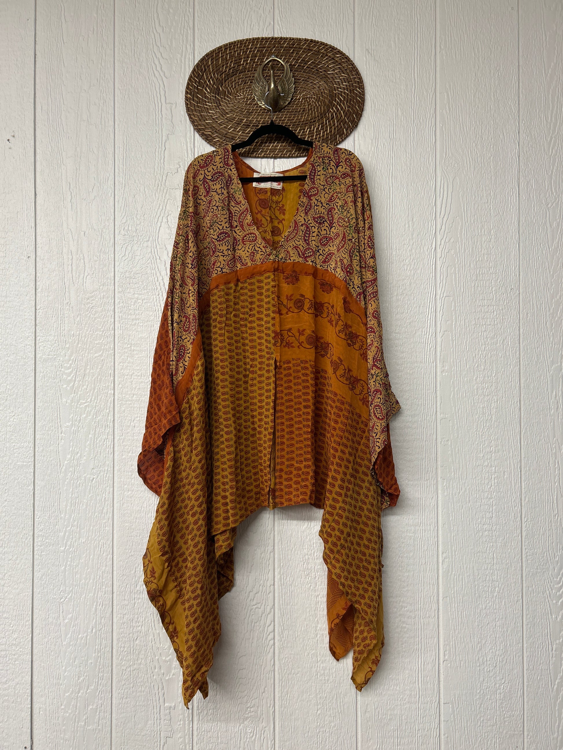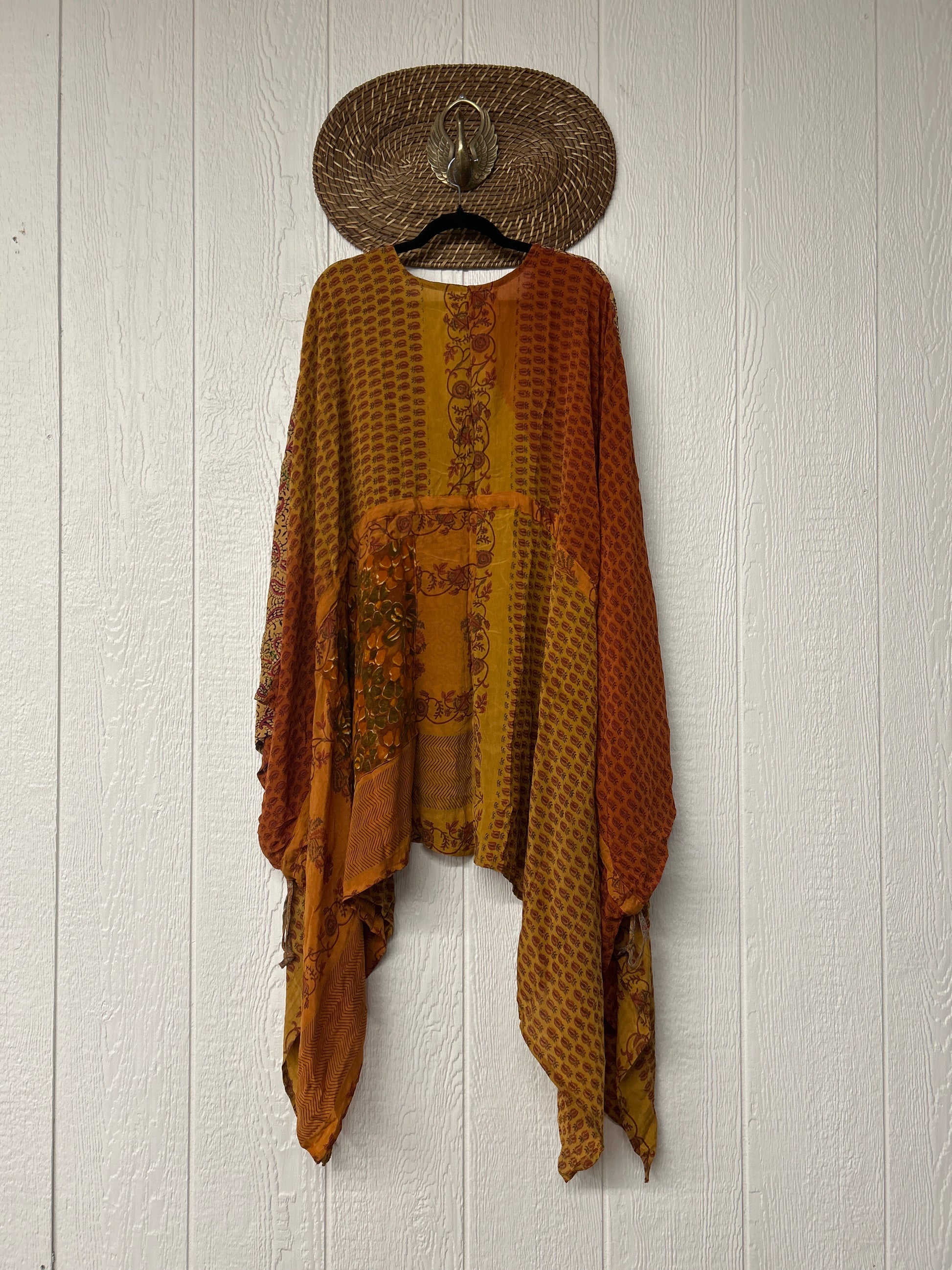 Fabrics may have small threads or holes in the layers. Color inconsistency or small stains may be present. The saris are sewn together and extend the life of each design.