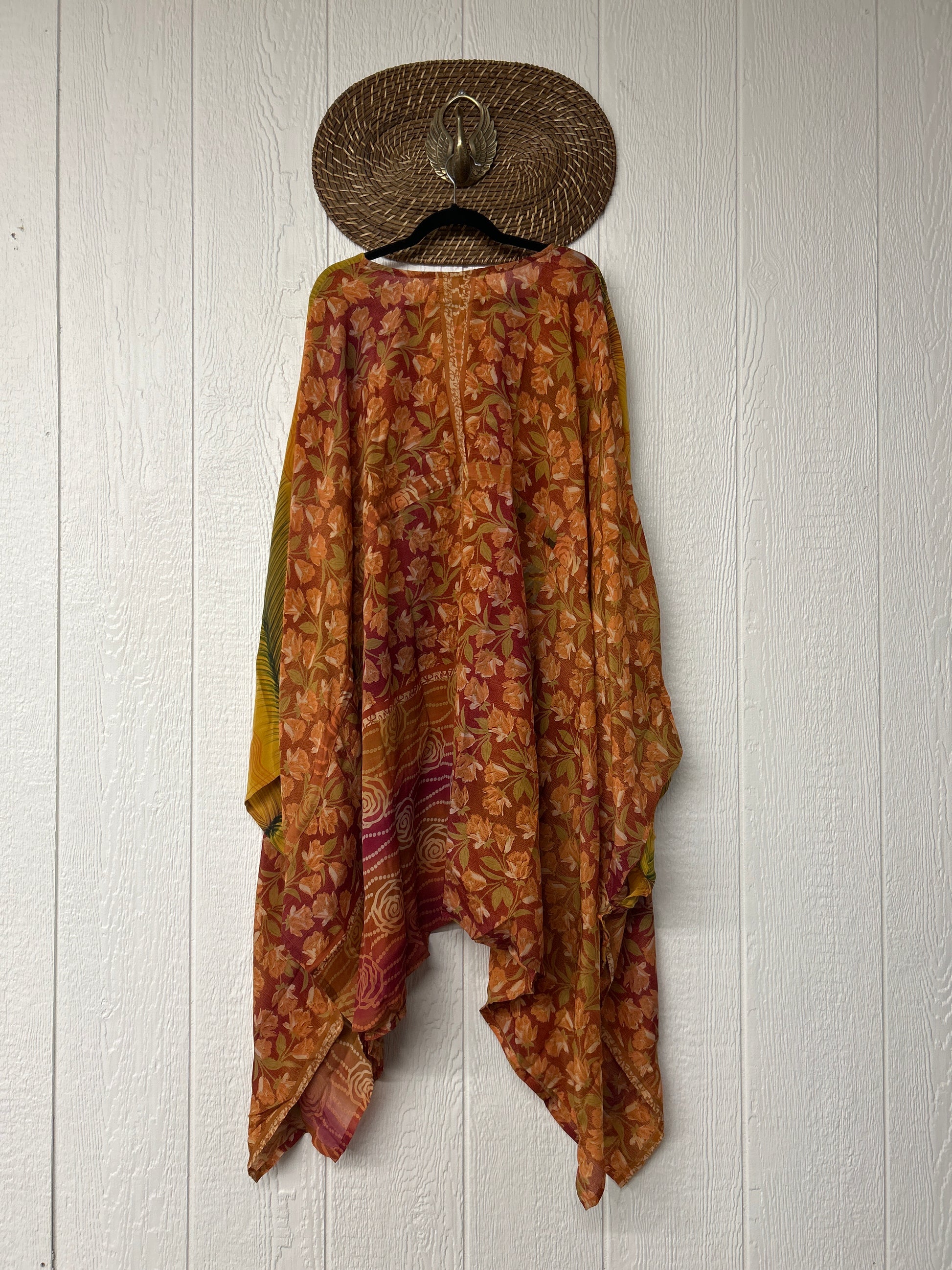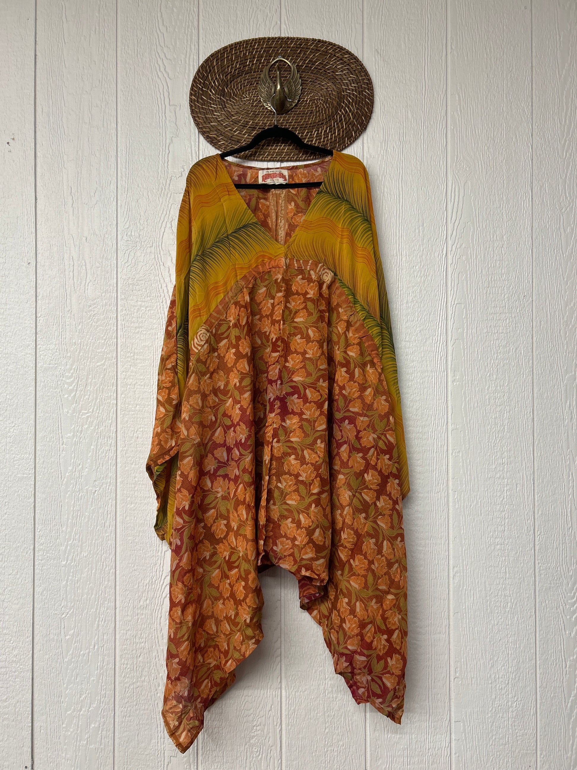 Fabrics may have small threads or holes in the layers. Color inconsistency or small stains may be present. The saris are sewn together and extend the life of each design.