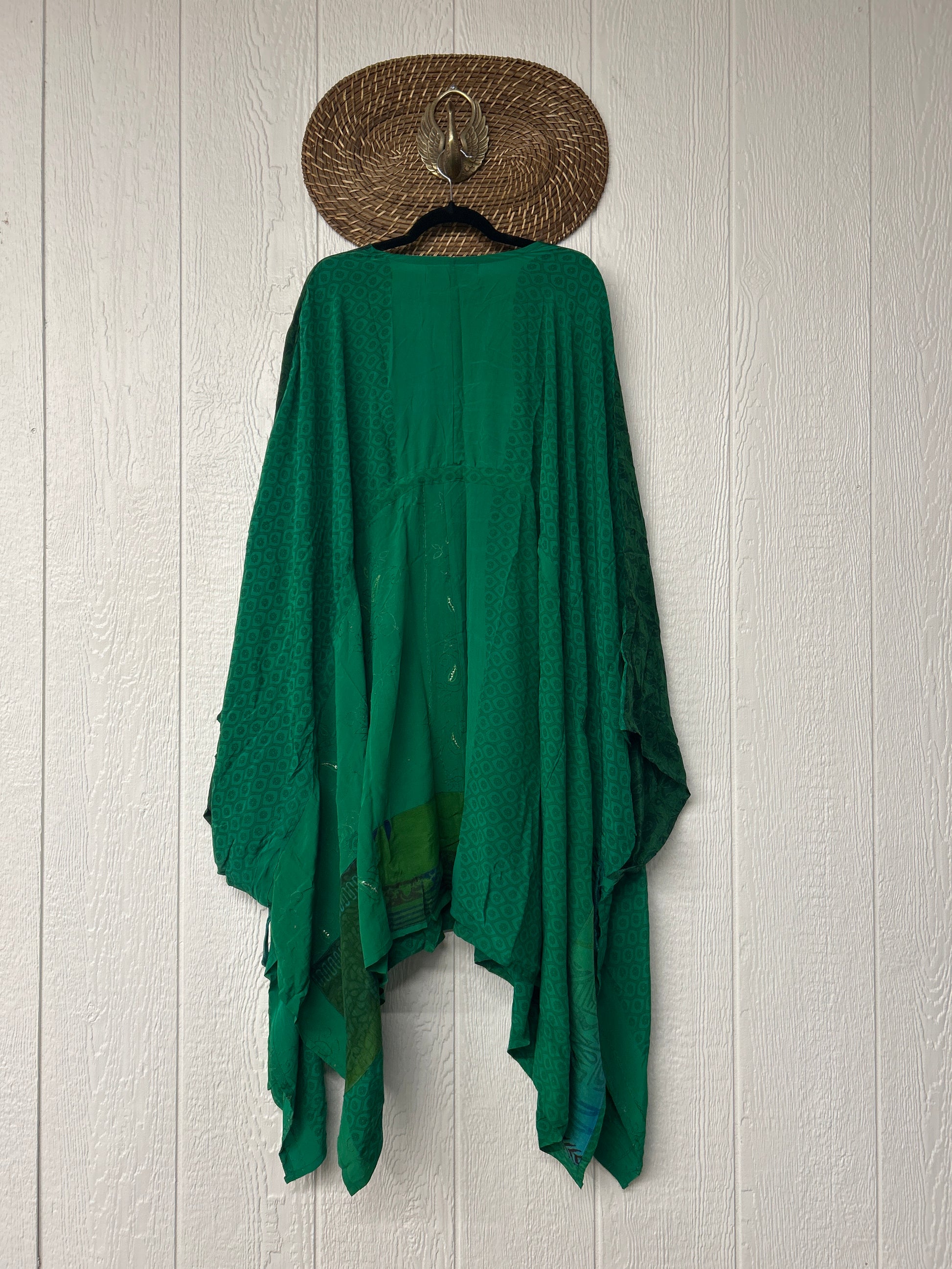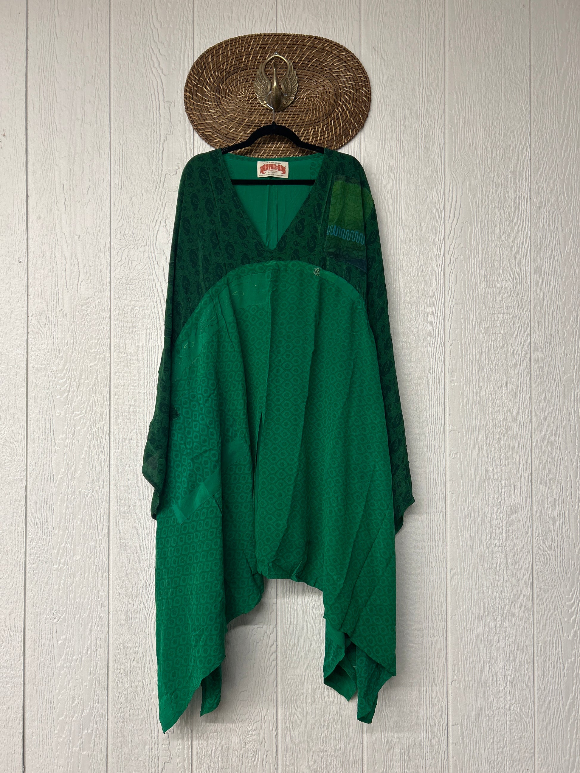 Fabrics may have small threads or holes in the layers. Color inconsistency or small stains may be present. The saris are sewn together and extend the life of each design.