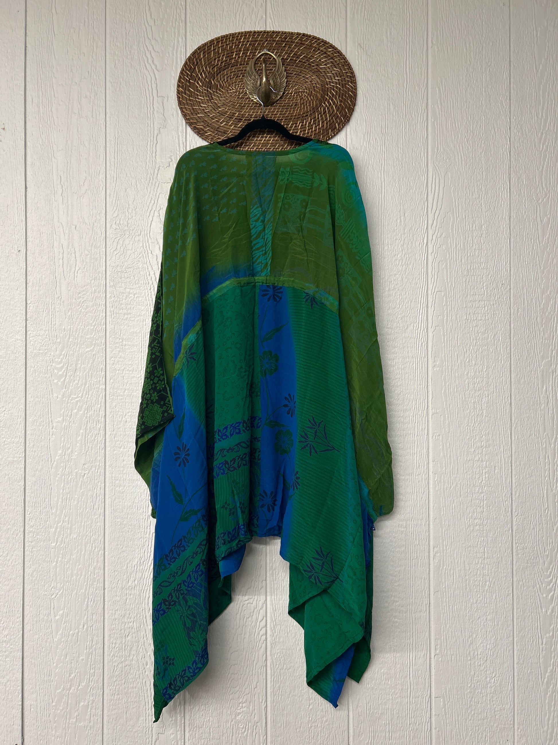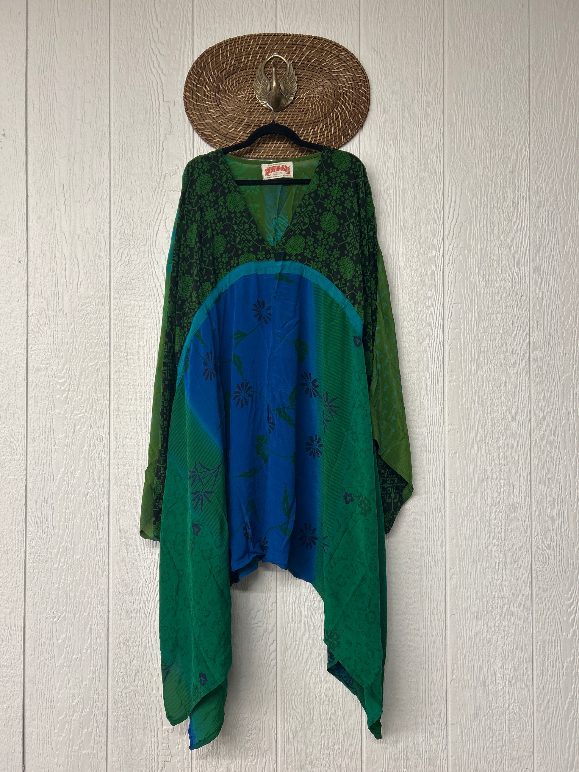 Fabrics may have small threads or holes in the layers. Color inconsistency or small stains may be present. The saris are sewn together and extend the life of each design.