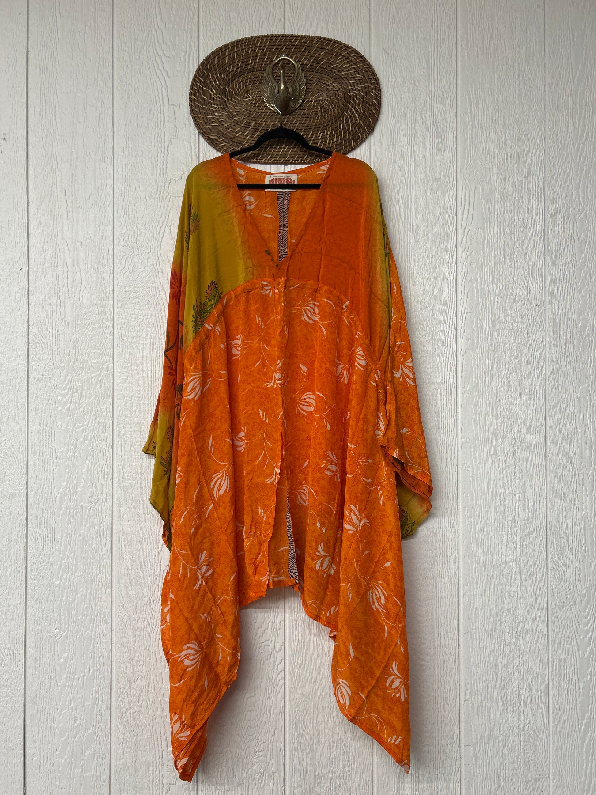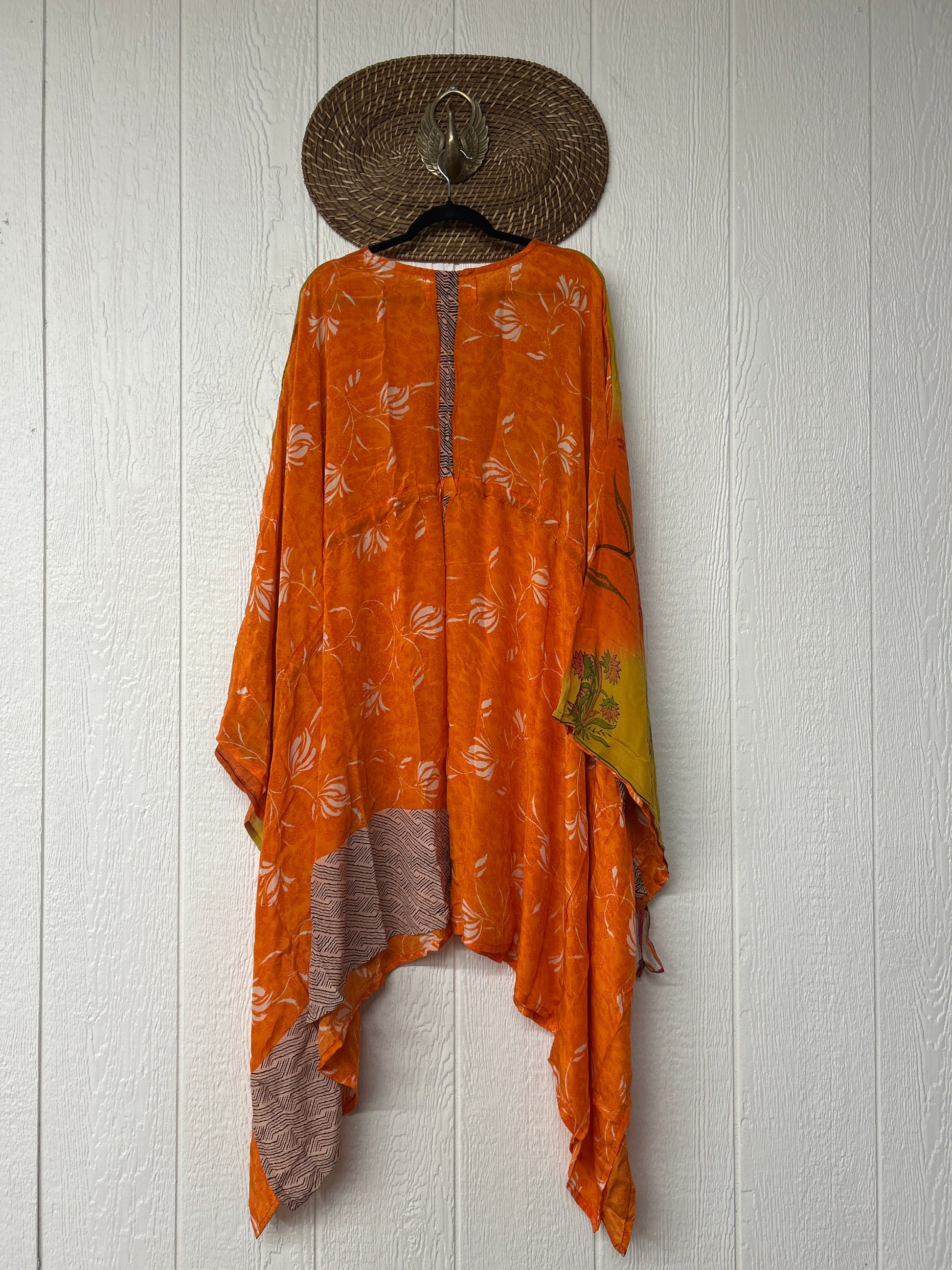 Fabrics may have small threads or holes in the layers. Color inconsistency or small stains may be present. The saris are sewn together and extend the life of each design.
